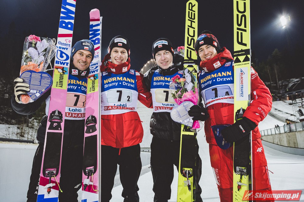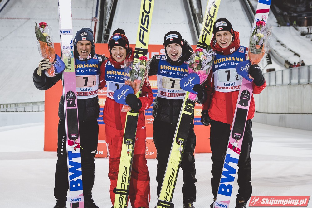 Reprezentacja Polski zajęła trzecie miejsce podczas sobotniego konkursu drużynowego w skokach narciarskich w Lahti. W składzie naszej ekipy znalazło się aż trzech zawodników WSS Wisła - Piotr Żyła, Paweł Wąsek i Aleksander Zniszczoł, a kadrę uzupełnił Kamil Stoch. To pierwszy taki przypadek w historii naszego klubu, żeby drużyna, w której składzie znalazło się trzech naszych skoczków stanęła na podium.