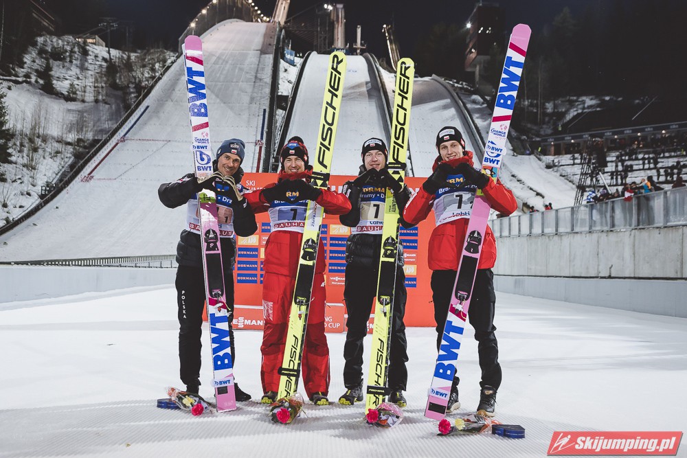 Po pierwszej serii Polacy sklasyfikowani byli nawet na drugim stopniu podium. Biało-Czerwoni zaczęli rywalizację od czwartej pozycji za sprawą Piotra Żyły (119 m). Po próbach Pawła Wąska (115 m) i Aleksandra Zniszczoła (123 m) nasza reprezentacja zajmowała już trzecią lokatę. Ostatecznie Kamil Stoch (128,5 m) wysunął ekipę Thomasa Thurnbichlera na pozycję wicelidera ze stratą 24 punktów do Austriaków.