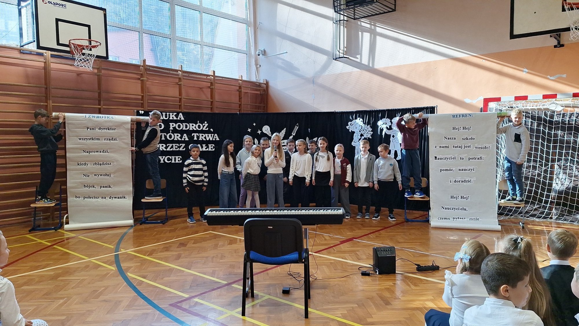 Podczas uroczystości z okazji Dnia Edukacji Narodowej uczniowie przygotowali program artystyczny, w którym śpiewali piosenki dedykowane nauczycielom oraz złożyli im serdeczne życzenia, dziękując za codzienną pracę, wsparcie i zaangażowanie. W ramach kontynuacji obchodów Dnia Edukacji Narodowej cała społeczność SP5 Wisła wybrała się do kina Helios.