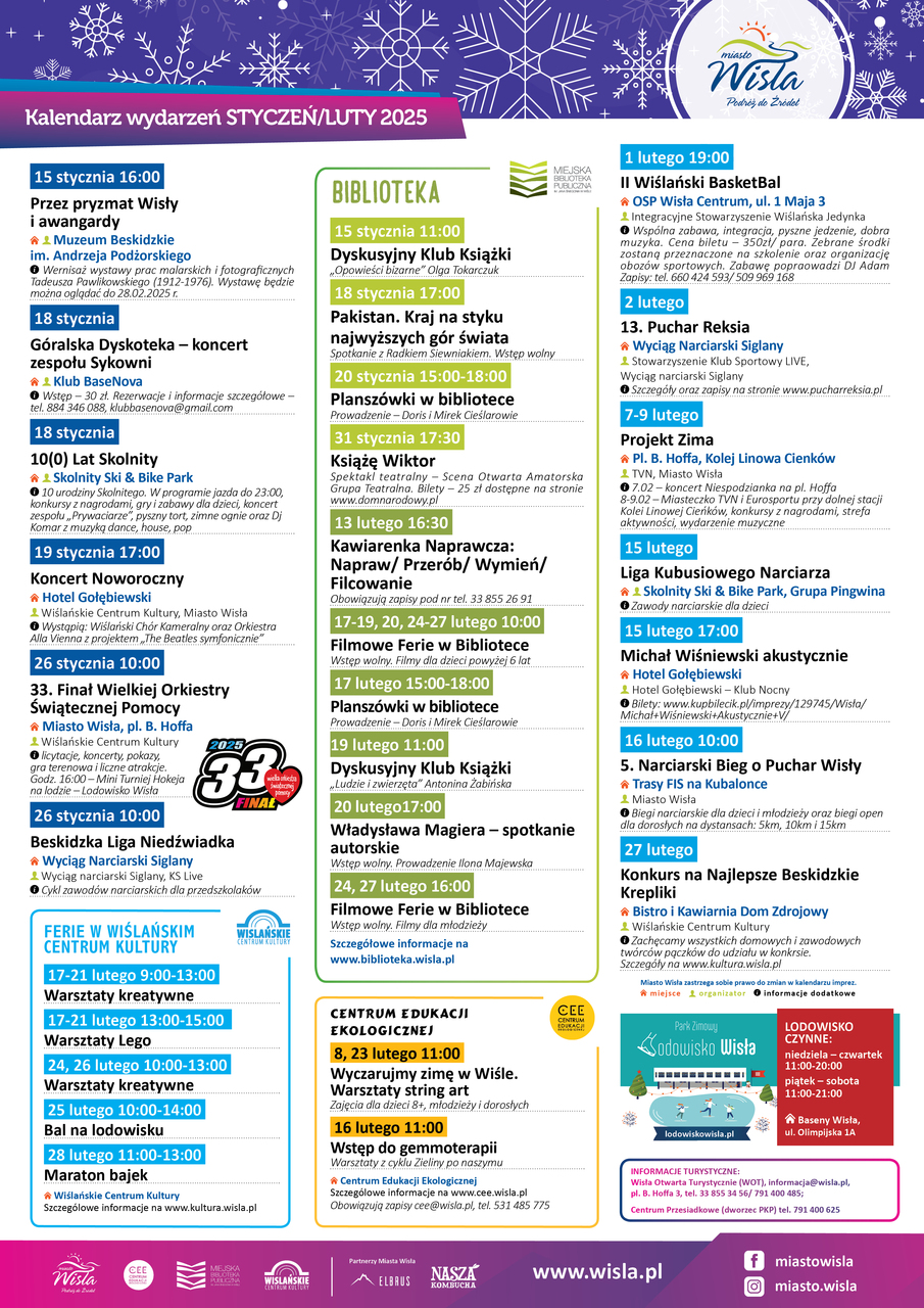 Przypominamy i zachęcamy gestorów branży hotelarskiej i nie tylko, do zapoznania się z aktualnym kalendarzem imprez organizowanych w Wiśle podczas ferii zimowych 2025. Kalendarze z harmonogramem wydarzeń dostępne także w biurze Informacji Turystycznej oraz na stronie internetowej do pobrania, w pliku poniżej.
