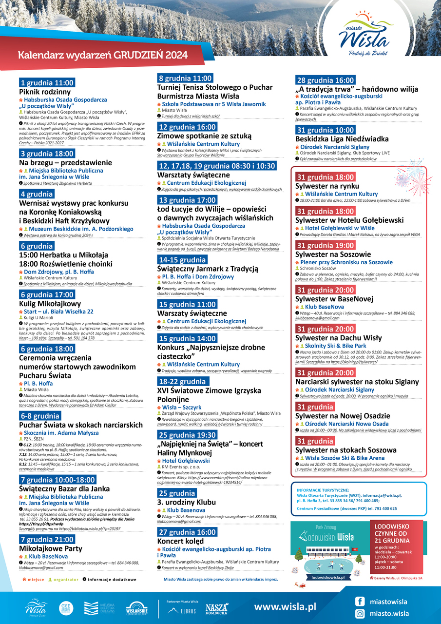 Przypominamy i zachęcamy gestorów branży hotelarskiej i nie tylko, do zapoznania się z aktualnym kalendarzem imprez organizowanych w Wiśle w grudniu. Kalendarze z harmonogramem wydarzeń dostępne także w biurze Informacji Turystycznej oraz na stronie internetowej do pobrania, w pliku poniżej.