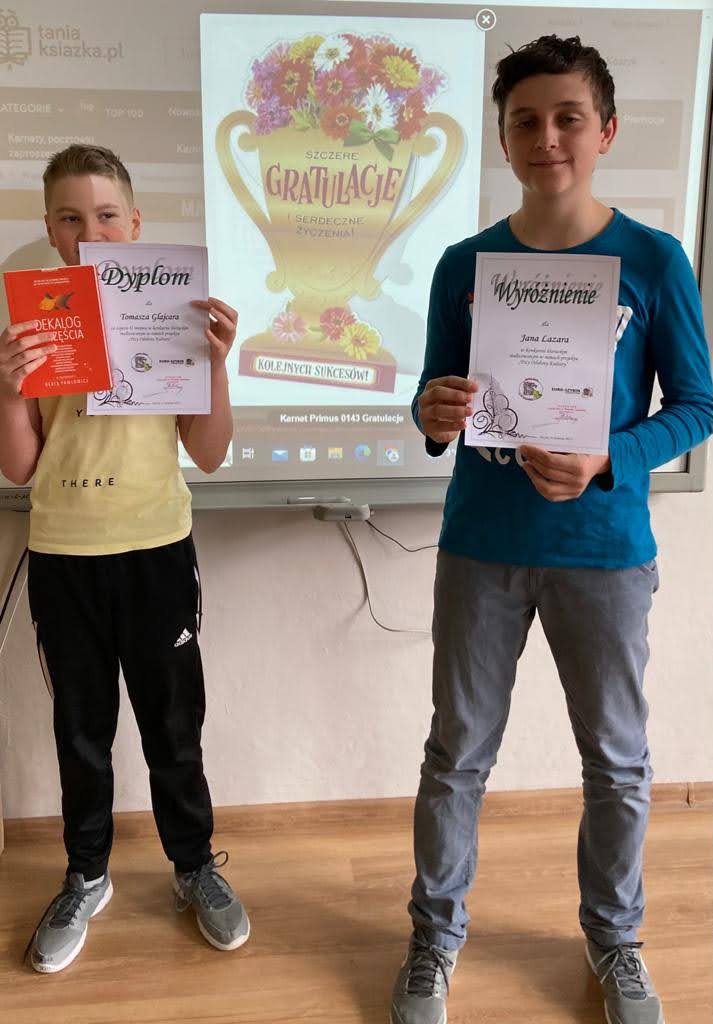 27 kwietnia, w VIII edycji projektu „Trzy Odsłony Kultury” organizowanego przez ZS im. Wł. Szybińskiego i COK „Dom Narodowy” pod patronatem Burmistrza Cieszyna, Starosty Cieszyńskiego również nie zabrakło naszych podopiecznych. W konkursie wokalnym wzięła udział Patrycja Bierska z kl. 7, a w konkursie literackim: Patrycja Bierska, Tomek Glajcar, Janek Lazar, Magda Mleko i Kasia Wysocka (siodmoklasisci). Jury nagrodziło naszych uczniów za ich działania literackie- Tomek zajął II miejsce, uzyskując tym samym tytuł laureata „Trzech Odsłon Kultury”, a Janek - wyróżnienie! Serdecznie gratulujemy!