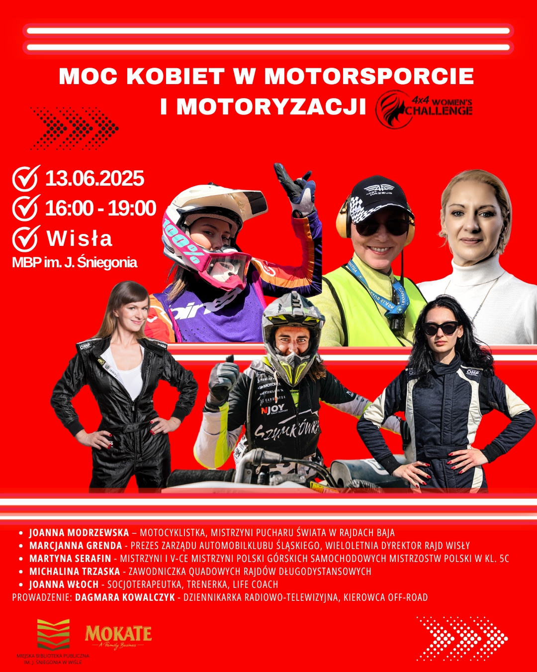 - 16:00 - "Moc kobiet w motosporcie i motoryzacji spotkanie Womens Challange 4x4" w @Miejska Biblioteka Publiczna im. J. Śniegonia,