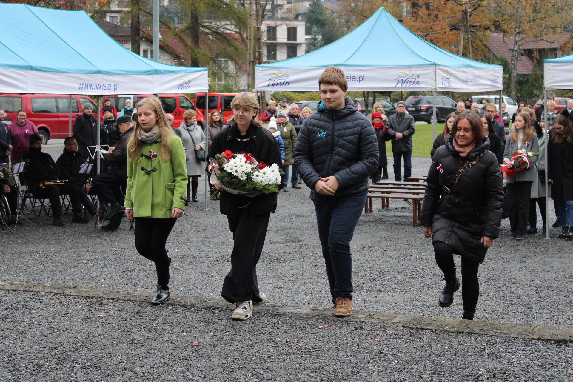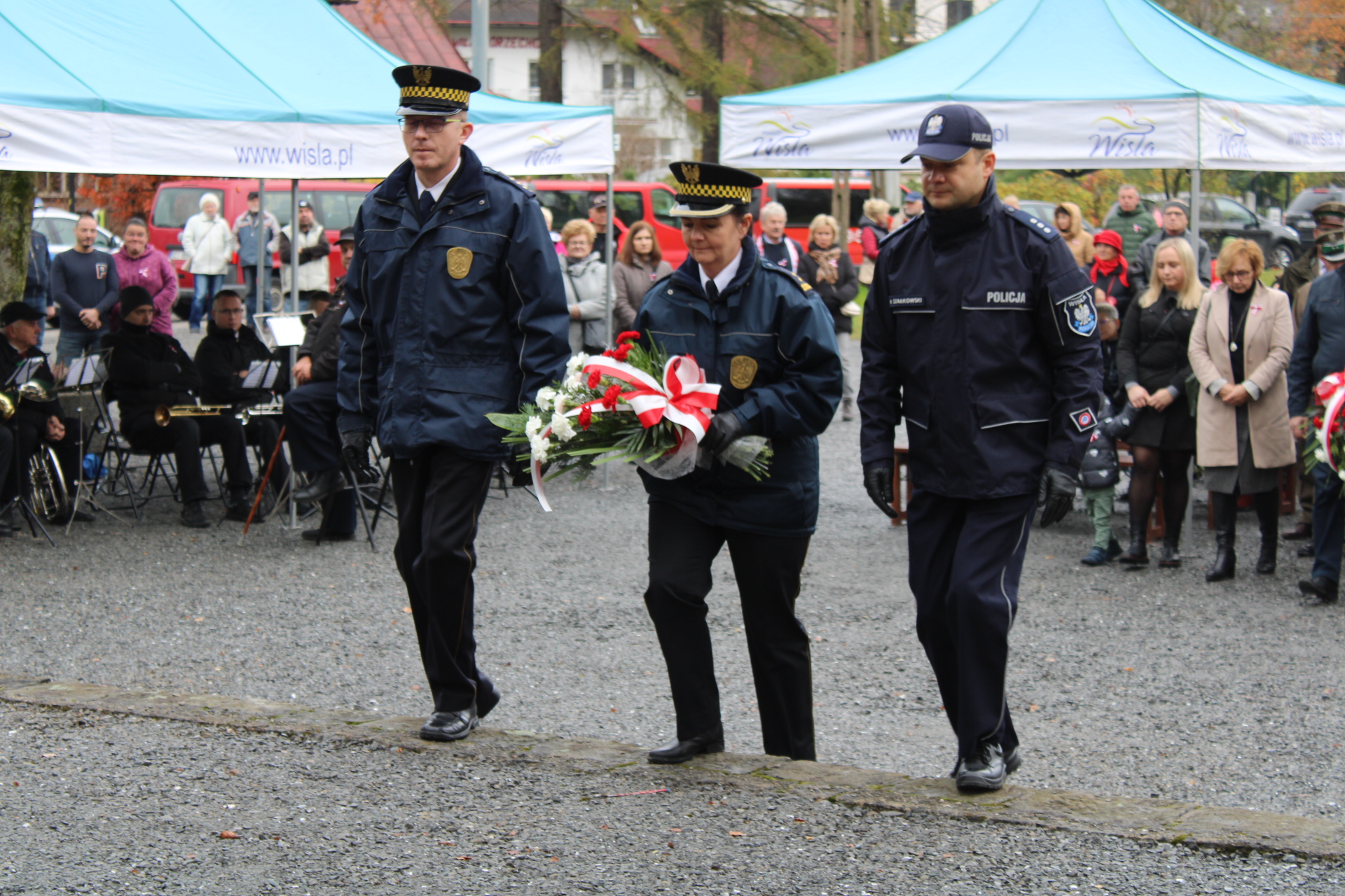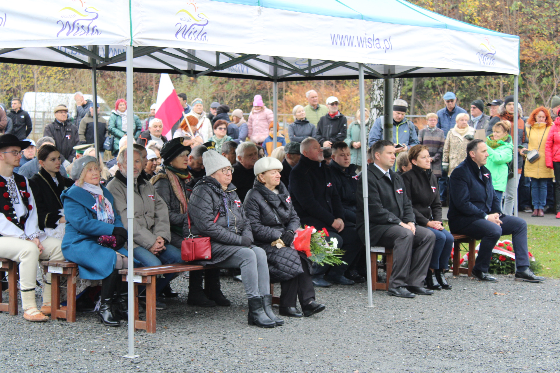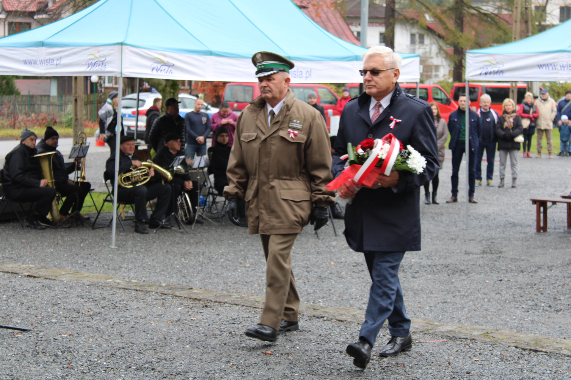 Przy werblach orkiestry pod pomnikiem złożono wieńce i wiązanki kwiatów. Wszystkie biało-czerwone, by oddać cześć tym, którzy walczyli i tym, którzy polegli w walce o wolność naszej ojczyzny. Jako pierwszy wieniec złożył burmistrz miasta w asyście sekretarza i skarbnika miasta, a zaraz po nich delegacja Rady Miasta. Nie zabrakło także delegacji i przedstawicieli Zarządu i Rady Powiatu Cieszyńskiego, Policji, Straży Miejskiej, Straży Granicznej, Zarządów Wiślańskich Osiedli, Nadleśnictwa Wisła, jednostek OSP z terenu Wisły, Górskiego Ochotniczego Pogotowia Ratunkowego, Wiślańskiego Centrum Kultury, Stowarzyszenia „Grupa Twórców Wiślanie”, Towarzystwa Miłośników Wisły, Wiślańskiej Akademii Aktywnych, Zespołu Regionalnego „Wisła”, Zespołu Regionalnego "Wisła Plus" i stowarzyszenia “Aktywni w Dziedzinie", PTTK/Oddziału Wisła i Koła Przewodników Beskidzkich, Szkoły Podstawowej nr 1 Wisła Centrum, Szkoły Podstawowej nr 2 Wisła Czarne, Zespołu Szkolno–Przedszkolnego nr 1 Wisła Głębce, Zespołu Szkolno-Przedszkolnego nr 2 Wisła Malinka, Szkoły Podstawowej nr 5 Wisła Jawornik, Liceum Ogólnokształcącego im. P. Stalmacha w Wiśle oraz Zespołu Szkół Gastronomiczno–Hotelarskich im. W. Reymonta w Wiśle. Honorową wartę przy pomniku pełnili członkowie Zespołu Regionalnego “Wisła”, którzy włączyli się również w odbieranie wieńców i wiązanek pod pomnikiem. Za ich pomoc i góralski akcent bardzo dziękujemy. Dziękujemy też wszystkim występującym artystom i osobom zaangażowanym w przebieg uroczystości oraz wszystkim tak licznie zgromadzonym przy pomniku mieszkańcom i gościom.