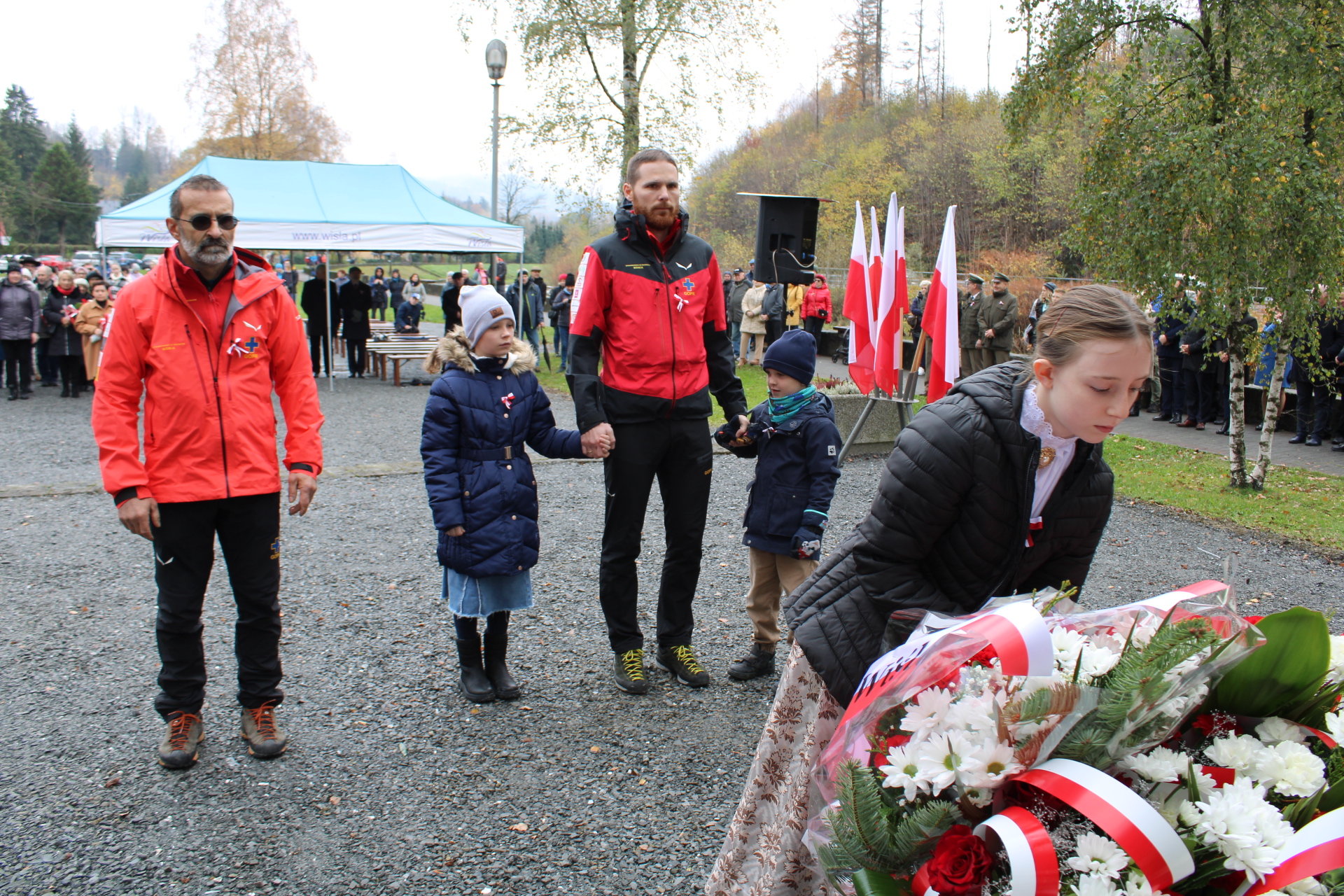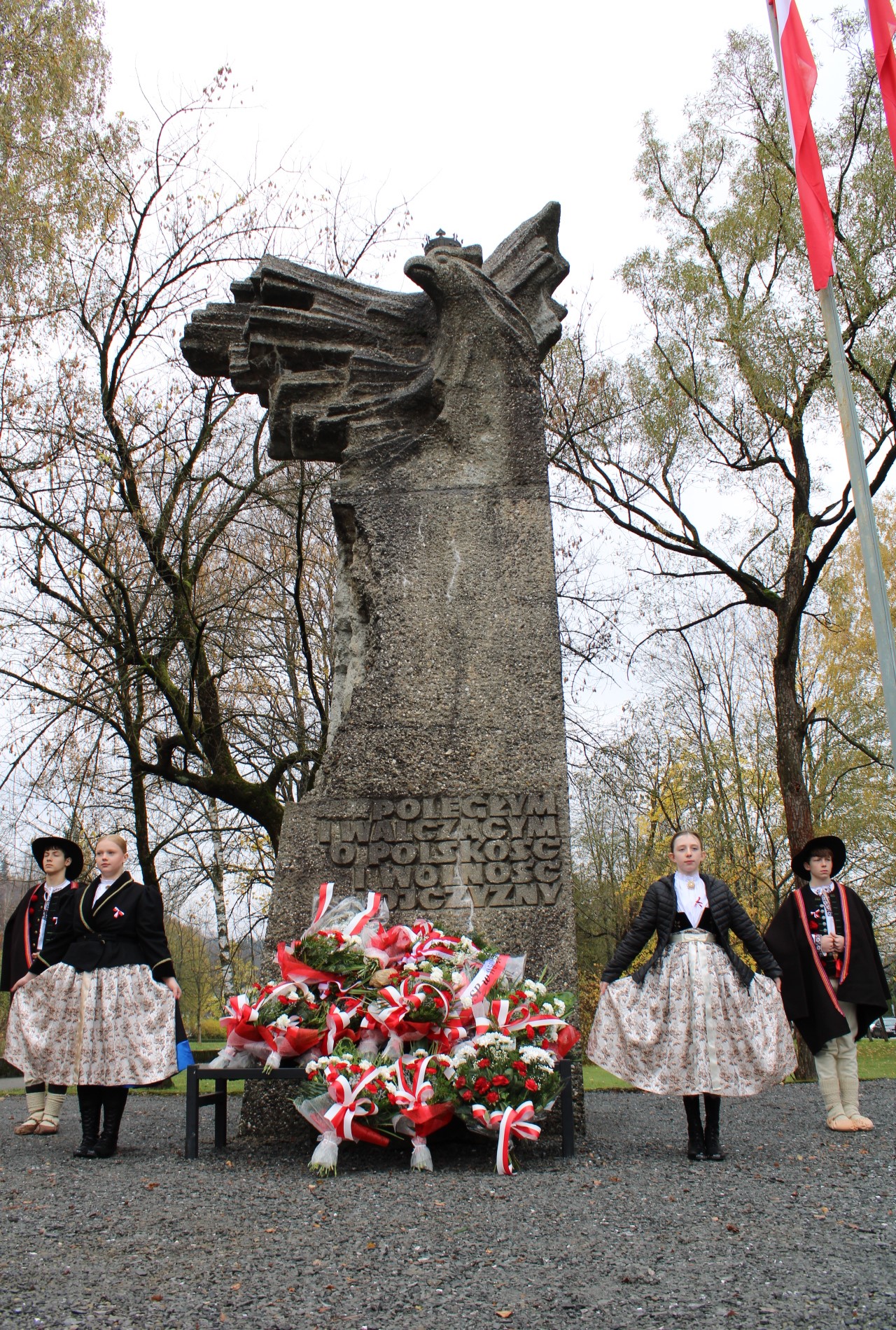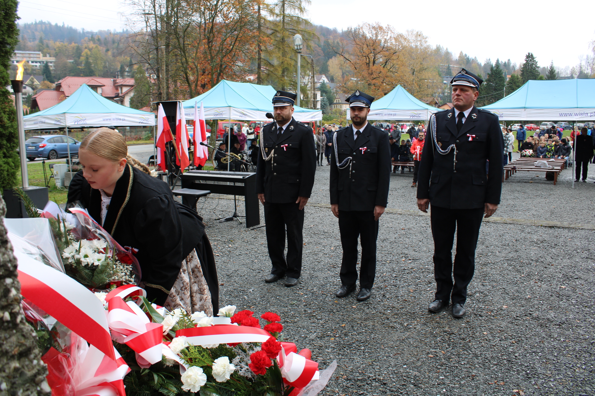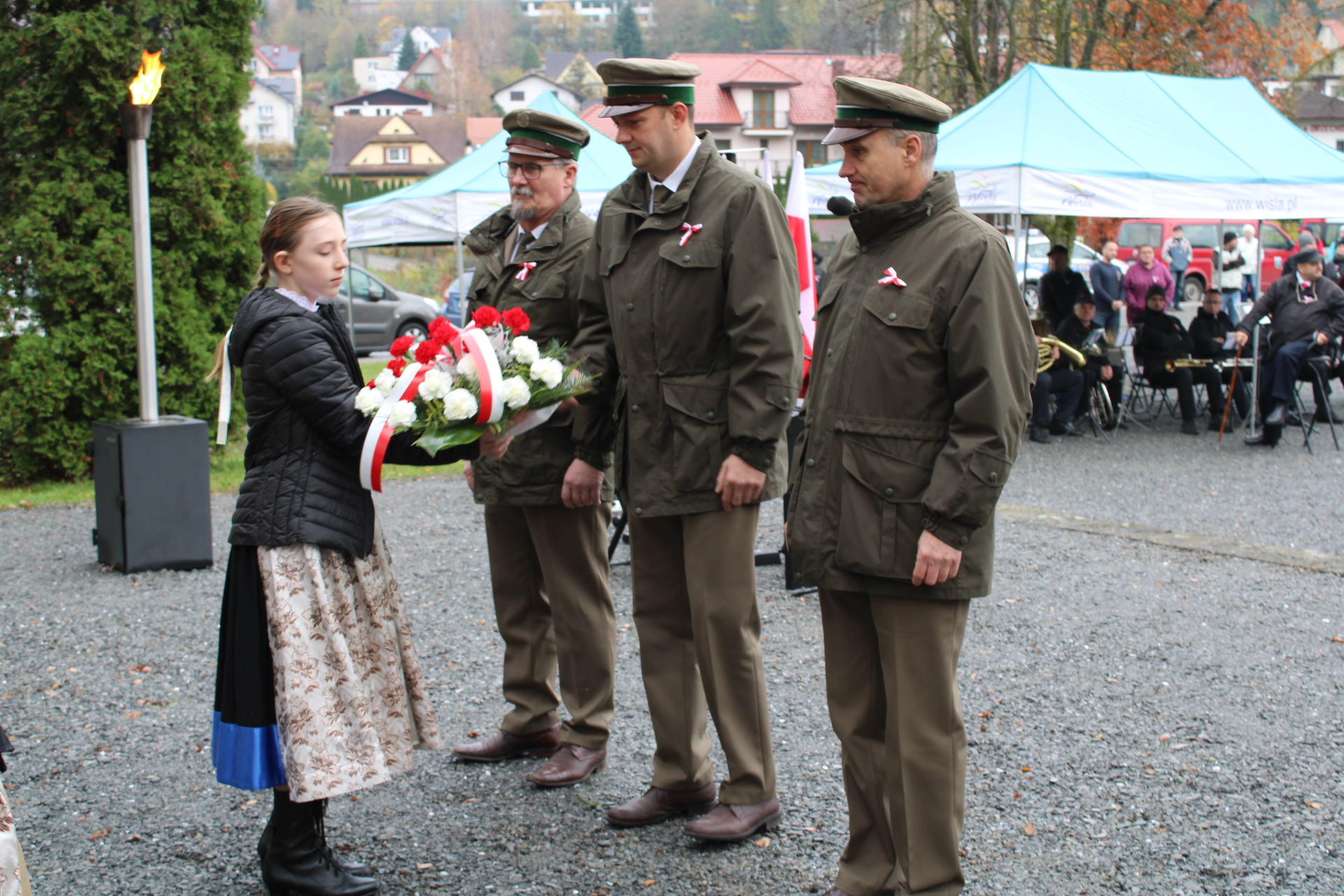 Przy werblach orkiestry pod pomnikiem złożono wieńce i wiązanki kwiatów. Wszystkie biało-czerwone, by oddać cześć tym, którzy walczyli i tym, którzy polegli w walce o wolność naszej ojczyzny. Jako pierwszy wieniec złożył burmistrz miasta w asyście sekretarza i skarbnika miasta, a zaraz po nich delegacja Rady Miasta. Nie zabrakło także delegacji i przedstawicieli Zarządu i Rady Powiatu Cieszyńskiego, Policji, Straży Miejskiej, Straży Granicznej, Zarządów Wiślańskich Osiedli, Nadleśnictwa Wisła, jednostek OSP z terenu Wisły, Górskiego Ochotniczego Pogotowia Ratunkowego, Wiślańskiego Centrum Kultury, Stowarzyszenia „Grupa Twórców Wiślanie”, Towarzystwa Miłośników Wisły, Wiślańskiej Akademii Aktywnych, Zespołu Regionalnego „Wisła”, Zespołu Regionalnego "Wisła Plus" i stowarzyszenia “Aktywni w Dziedzinie", PTTK/Oddziału Wisła i Koła Przewodników Beskidzkich, Szkoły Podstawowej nr 1 Wisła Centrum, Szkoły Podstawowej nr 2 Wisła Czarne, Zespołu Szkolno–Przedszkolnego nr 1 Wisła Głębce, Zespołu Szkolno-Przedszkolnego nr 2 Wisła Malinka, Szkoły Podstawowej nr 5 Wisła Jawornik, Liceum Ogólnokształcącego im. P. Stalmacha w Wiśle oraz Zespołu Szkół Gastronomiczno–Hotelarskich im. W. Reymonta w Wiśle. Honorową wartę przy pomniku pełnili członkowie Zespołu Regionalnego “Wisła”, którzy włączyli się również w odbieranie wieńców i wiązanek pod pomnikiem. Za ich pomoc i góralski akcent bardzo dziękujemy. Dziękujemy też wszystkim występującym artystom i osobom zaangażowanym w przebieg uroczystości oraz wszystkim tak licznie zgromadzonym przy pomniku mieszkańcom i gościom.