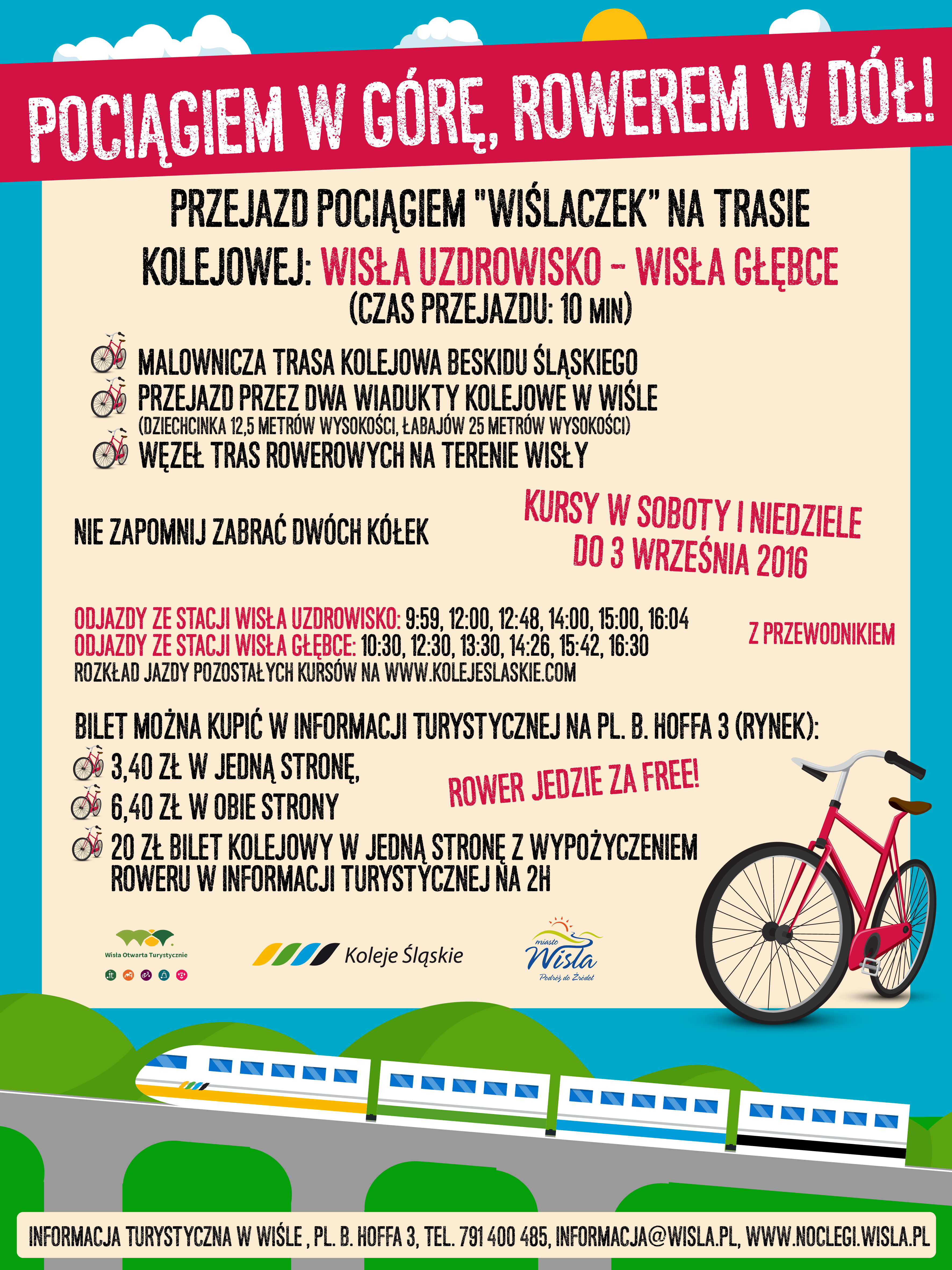Połączenia wakacyjne z przewodnikiem ze stacji Wisła Uzdrowisko będą ruszać o: 09:59, 12:00, 12:48, 14:00, 15:00 i 16:04. W drogę powrotną z dworca Wisła Głębce wyruszymy o: 10:30, 12:30, 13:30, 14:26, 15:42 i 16:30. Na pozostałe pociągi, według rozkładu, również obowiązuje promocja bezpłatnego transportu roweru. Ponadto pasażerowie będą mogli kupić bilet powrotny w cenie 6,40 zł w obie strony, lub specjalny bilet obejmujący wypożyczenie jednośladu w cenie 20 złotych (zakup tylko w punkcie Informacji Turystycznej na placu Hoffa 3).