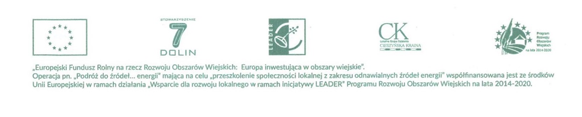 Operacja pn. "Podróż do źródeł... energii" mająca na celu "przeszkolenie społeczności lokalnej z zakresu odnawialnych źródeł energii" współfinansowana ze środków Unii Europejskiej w ramach działąnia "Wsparcie dla rozwoju lokalnego w ramach inicjatywy LEADER" Programu Rozwoju Obszarów Wiejskich na lata 2014-2020.