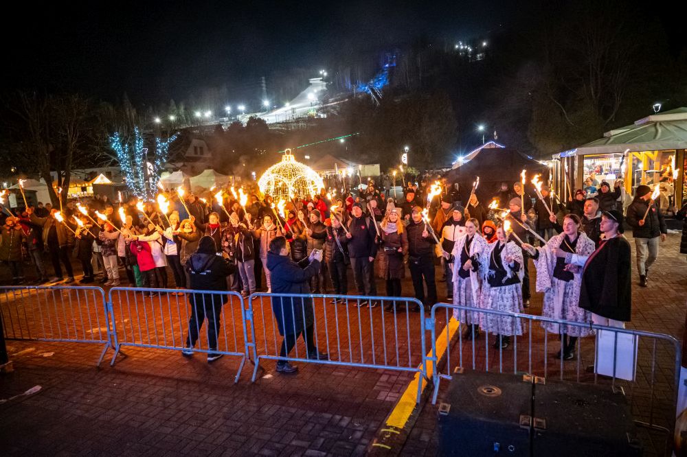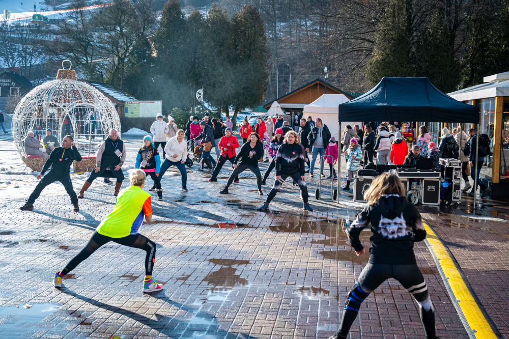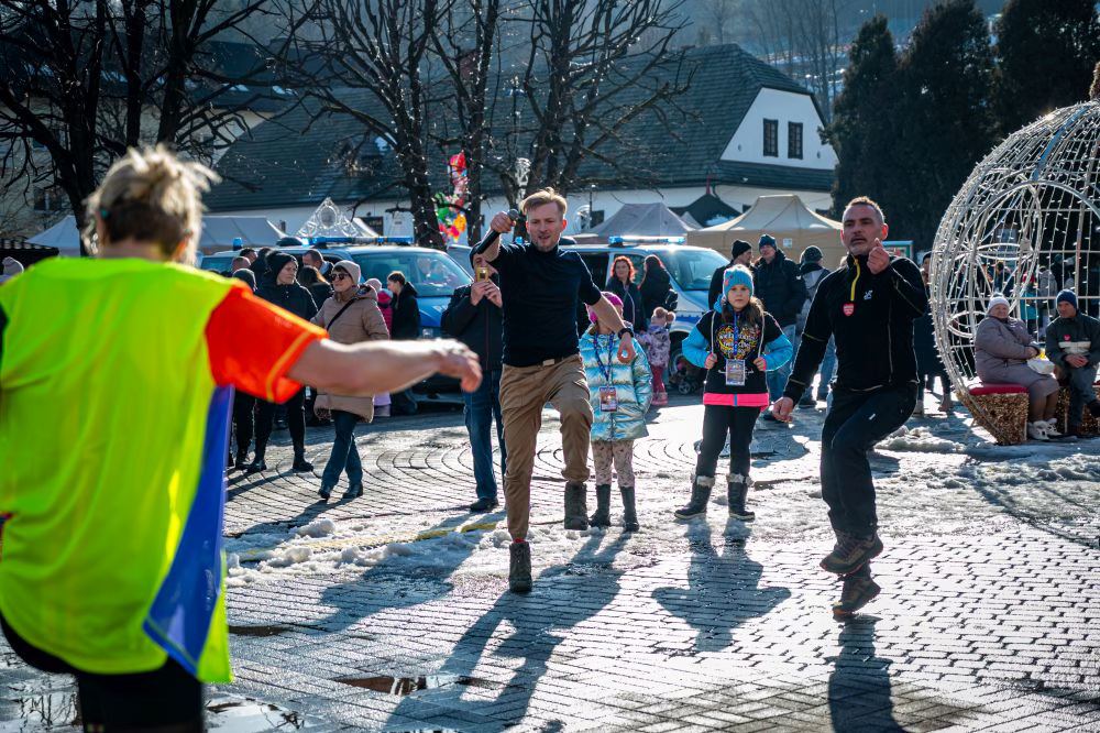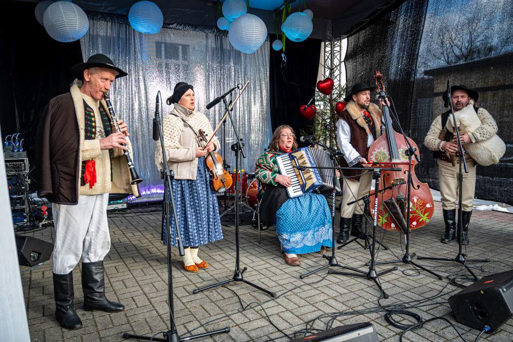 Po paradzie na scenę wkroczyła Męska Grupa Śpiewacza "Tkocze", która w brawurowy sposób zawładnęła publicznością wykonując góralską wersję "My cyganie"/ "My gorole". Kto nie widział i nie słyszał niech żałuje! Panowie mieli również swoje 5 minut na ściance, gdzie za piątaka można było sobie zrobić zdjęcie "z góralem". Po "Tkoczach" swój występ miał Wiślański Chór Kameralny, który zawodowo zaangażował publiczność do wspólnego chóralnego śpiewu. W międzyczasie na Lodowisko Wisła odbył się Miniturniej Hokeja na Lodzie. Po trudnej walce ze wspaniałym przeciwnikiem wygrała drużyna Tomasza Bujoka, a na Skolnitym zjechał 40-osobowy wąż z sercami.