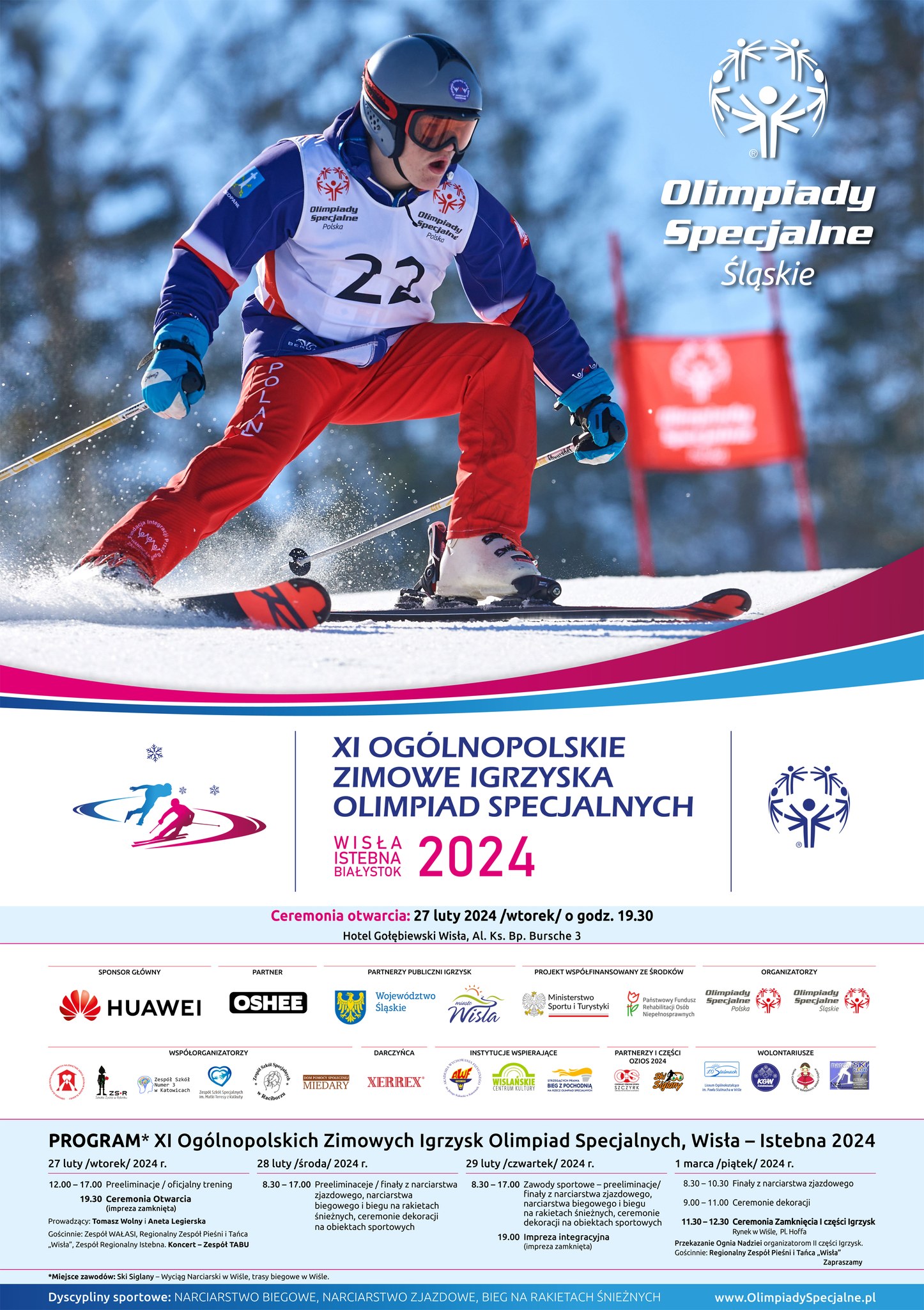 Start już jutro (27 lutego) w Wiśle. Na wydarzenie zaprasza burmistrz miasta Tomasz Bujok, Przewodniczący Komitetu Organizacyjnego I części OZIOS2024 Igrzysk Dariusz Wosz oraz Dyrektor Generalny Olimpiad Specjalnych Polska Joanna Styczeń-Lasocka.