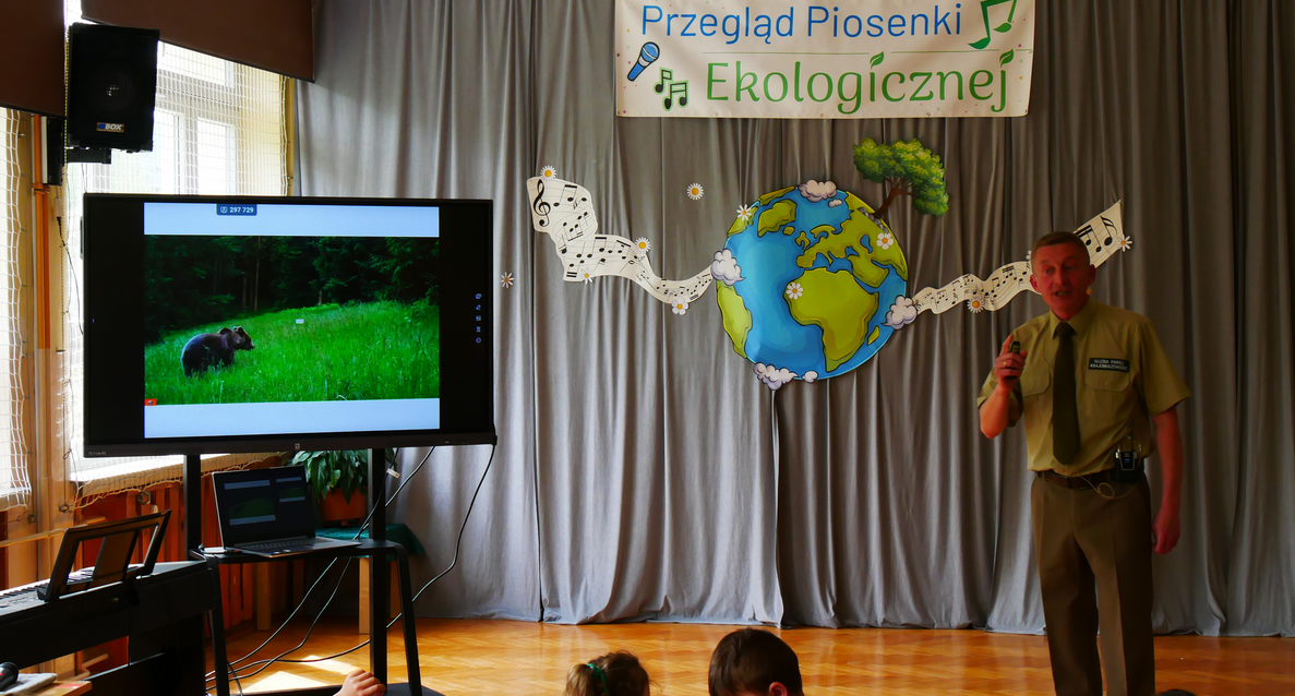Pierwszym punktem przeglądu była nauka wspólnej piosenki ekologicznej, w której zebranych prowadziła Pani Bela Troszok oraz uczennice klasy 6 i 7 SP2, przy akompaniamencie gitary. Po wspólnym rozśpiewaniu wysłuchaliśmy ciekawej prelekcji na temat ssaków Beskidu Śląskiego, którą wygłosił tegoroczny gość specjalny przeglądu - Pan Piotr Dziki z Ośrodka Edukacyjnego Zespołu Parków Krajobrazowych Województwa Śląskiego w Żywcu. Następnie przeszliśmy do wysłuchania występów uczestników przeglądu. Zaprezentowane utwory wprawiły wszystkich w radosny nastrój, a przede wszystkim poruszały ważne ekologiczne tematy. Przegląd zakończył się wręczeniem upominków dla występujących ufundowanych przez Miasto Wisła oraz Stowarzyszenie “Nad Białką”. Na pożegnanie raz jeszcze zaśpiewaliśmy wspólną piosenkę, a następnie uczestnicy przeglądu oraz goście udali się na poczęstunek przygotowany przez Radę Rodziców.