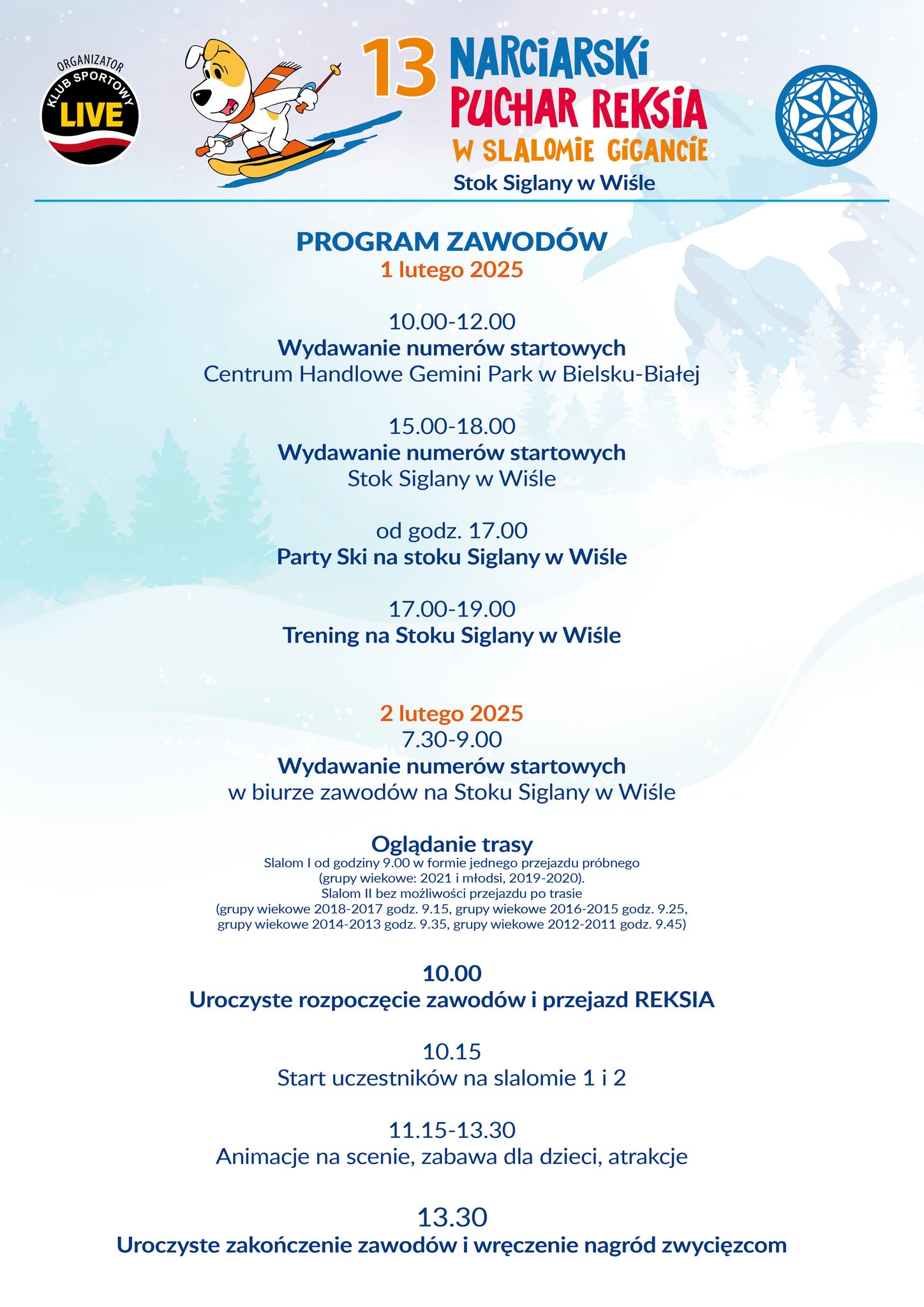Na Reksiaki czeka dwudniowa (1-2 lutego) zabawa na śniegu na gościnnym Stoku Siglany w Wiśle. Pierwszy dzień zawodów, w którym odbędzie się oficjalny trening, zakończy afterparty z zabawą przy muzyce. W kolejnym dniu młodzi amatorzy białego szaleństwa wystartują na dwóch slalomach. Krótszym dla początkujących, dłuższym dla bardziej zaawansowanych. Zawodnicy wystartują w sześciu kategoriach wiekowych z podziałem na dziewczynki i chłopców. Najszybsi otrzymają puchary i cenne nagrody. Także każdy z Reksiaków, bez względu na miejsce, które zajmie w zawodach, otrzyma pakiet startowy, a w nim medal, numer startowy oraz upominki. Szczegóły w regulaminie na stronie: www.pucharreksia.pl.