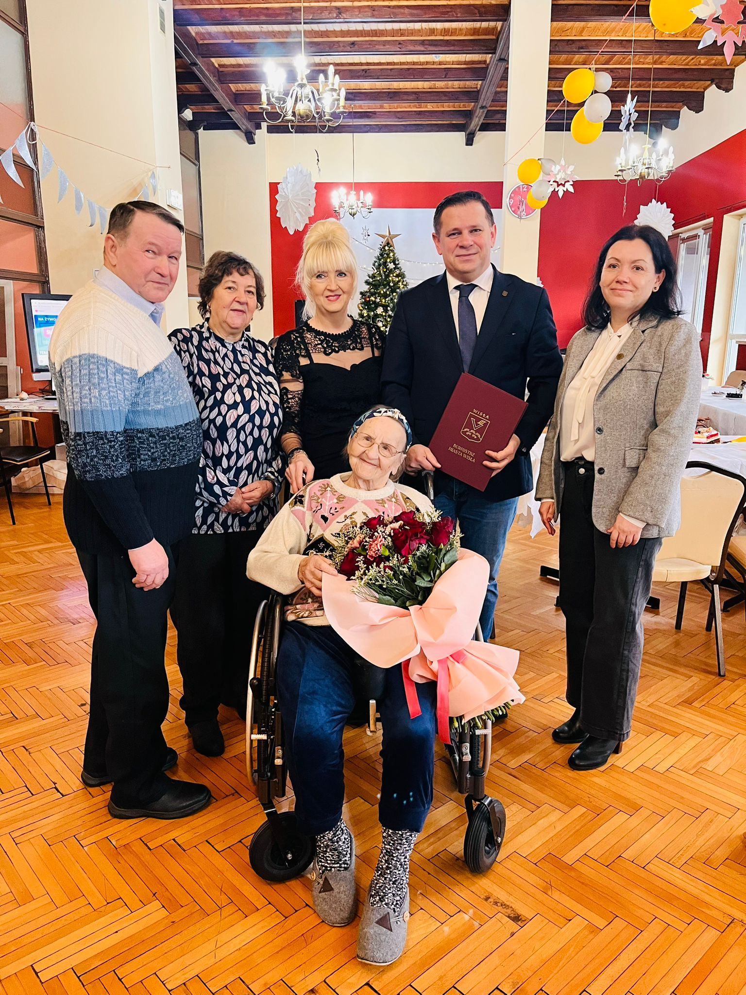 Pani Helenie został przekazany list gratulacyjny, bukiet kwiatów oraz upominek wraz z życzeniami zdrowia, radości oraz kolejnych pięknych lat w otoczeniu najbliższych.