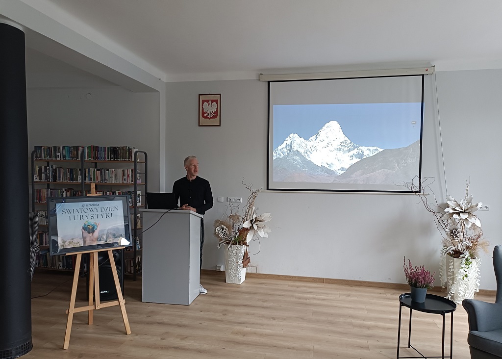 Następnie oddaliśmy głos panu Tadeuszowi Papierzyńskiemu, osobie, która łączy wiele pasji, ale to właśnie podróże zajmują miejsce szczególne w życiu naszego gościa. Pan Tadeusz "zabrał nas" na szczyty: Ama Dablam (6812 m n.p.m.) i Awicenny (7134 m.n.p.m.).