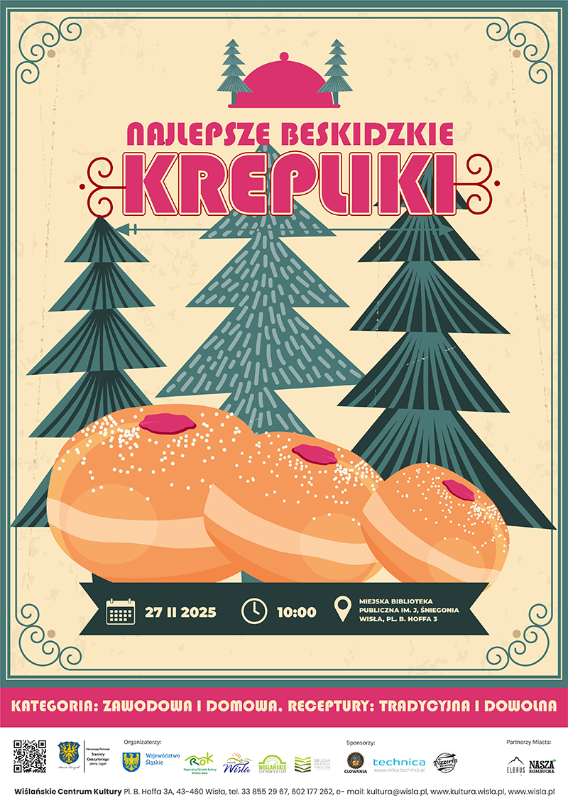 Jak co roku zapraszamy Państwa do udziału w fantastycznym tłustoczwartkowym Konkursie na Najlepsze Beskidzkie Krepliki. W tym roku konkurs odbędzie się 27 lutego o godzinie 10.00 w holu Miejskiej Biblioteki Publicznej im. Jana Śniegonia w Wiśle. Konkurs skierowany jest do mieszkańców powiatu cieszyńskiego.