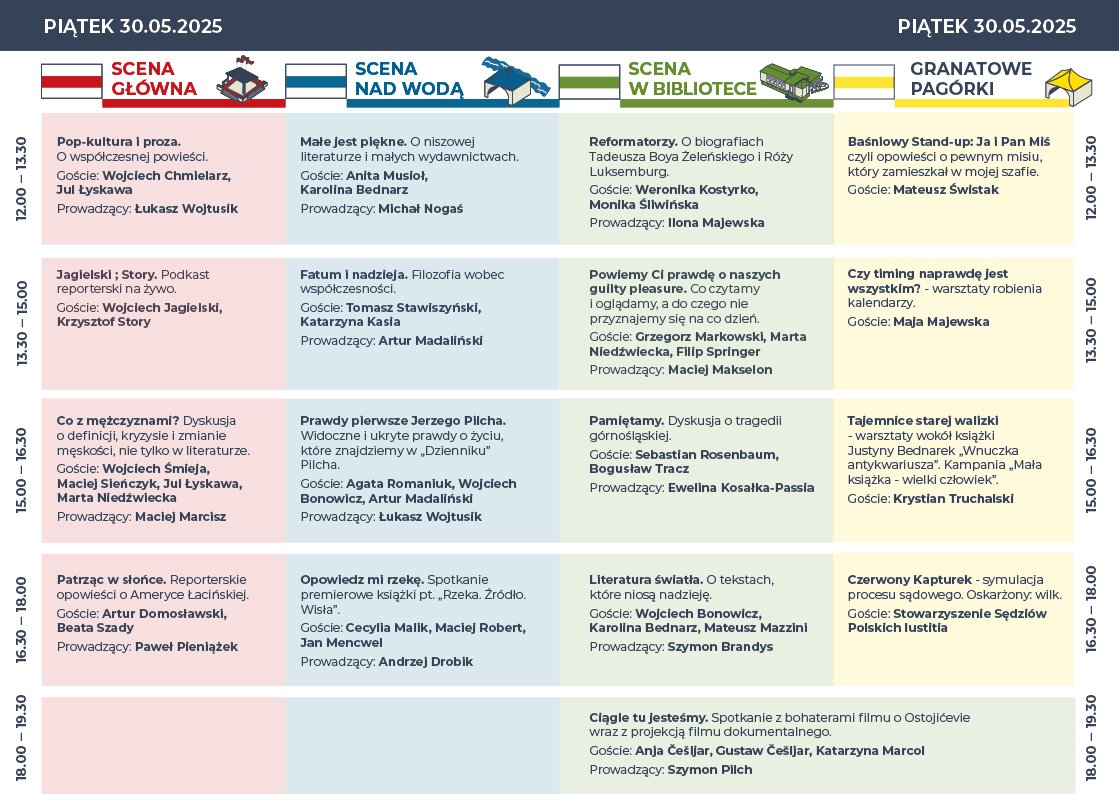 Już od 26 maja na antenie Radia Katowice można będzie usłyszeć zaproszonych gości, którzy opowiedzą o swoich oczekiwaniach, festiwalowych planach i osobistym spojrzeniu na znaczenie literatury w przestrzeni publicznej. To była doskonała rozgrzewka przed oficjalnym rozpoczęciemi festiwalowych atrakcji. A rozpoczęcie w tym roku będzie wyjątkowe, ponieważ już 29 maja (czwartek) odbędzie się uroczyste przedstawienie muralu Jerzego Pilcha, który powstał na jednej ze ścian budynku za Urzędem Miasta Wisła. Wybór daty także nie jest przypadkowy, gdyż właśnie w tym dniu będziemy obchodzić piątą rocznicę śmierci znanego wiślańskiego pisarza. Natomiast zaraz po tym wydarzeniu, o godz. 19:30 odbędzie się koncert okolicznościowy PILCH/HADYNA, w wykonaniu Zespołu Pieśni i Tańca ŚLĄSK na scenie Amfiteatru im. Stanisława Hadyny w Wiśle.