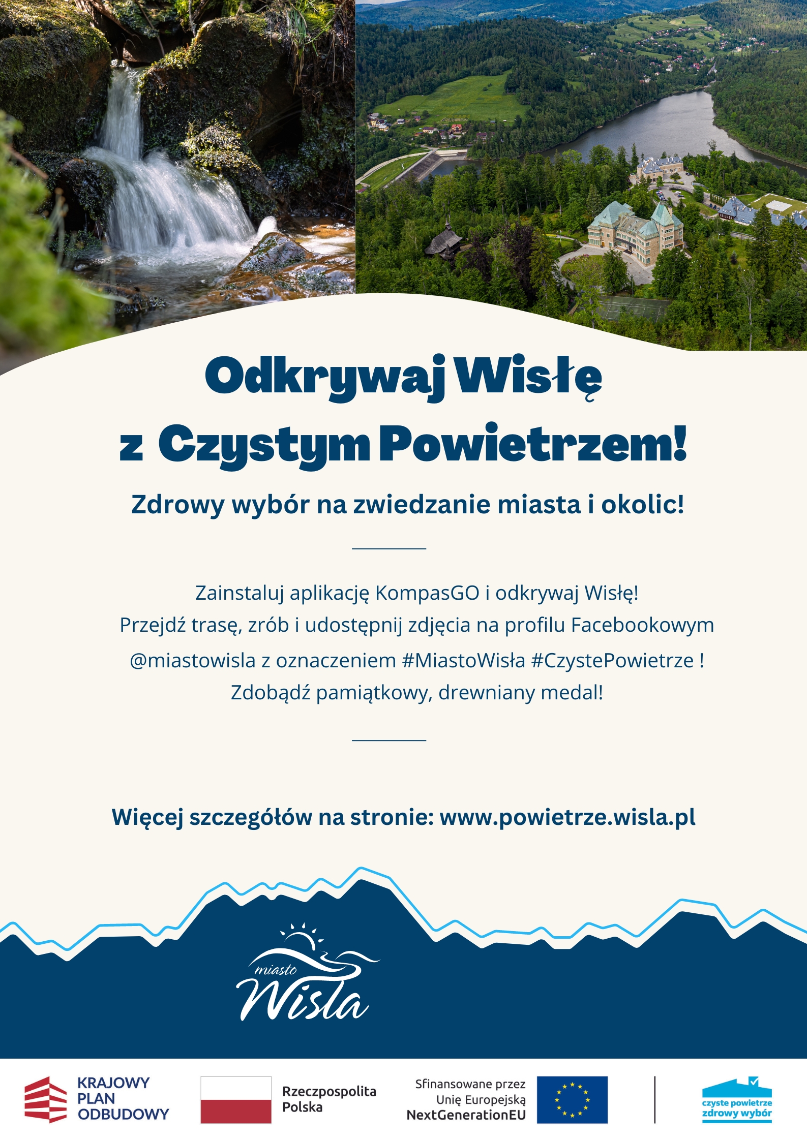 Dlatego zapraszamy wszystkich do korzystania z wyznaczonych ścieżek w aplikacji KompasGo i zdobywania punków w ramach naszej akcji. Podczas spacerów i wypraw róbcie zdjęcia ukazujące piękno przyrody i czystego powietrza miasta Wisła. Przesyłajcie je na Facebookowy profil @miastowisla wraz z oznaczeniem #MiastoWisła #CzystePowietrze. Każdy uczestnik górskich wędrówek z KompasGo i Czystym Powietrzem w mieście Wisła otrzyma pamiątkowy, drewniany medal!