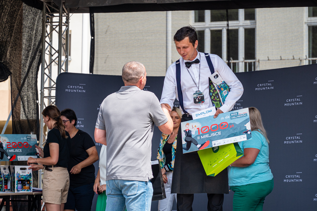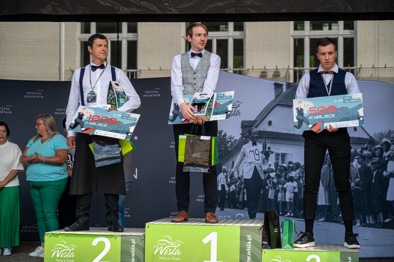 W kategorii mężczyzn swoją świetną dyspozycję potwierdził zeszłoroczny zwycięzca Biegu Kelnerów Jeremiasz Bujok z SiSi Pizzeria e Ristorane, który na trasie był nie do pokonania, dodatkowo nie uronił ani kropli z niesionych napojów. Na miejscu drugim uplasował się Maciej Łusiński, który również w latach ubiegłych stawał na podium Biegu Kelnerów, a reprezentujący DW Bartek. Na miejscu trzecim stanął Szymon Gogółka z Restauracji Kącik Zbójnicki.