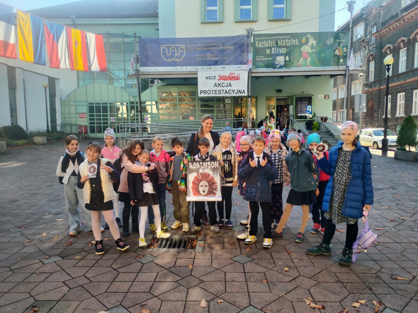 w spektaklu "Robinson" na motywach powieści Daniela Defoe. Bajkowa inscenizacja zabrała młodych widzów na bezludną wyspę, gdzie główny bohater, podobnie jak Robinson Crusoe, przeżywał niesamowite przygody. Dzięki przepięknej oprawie plastycznej, muzyce oraz lalkom i maskom dzieci mogły przenieść się do świata pełnego wyobraźni. Spektakl przypomniał wszystkim, że nawet w trudnych chwilach zawsze można liczyć na wsparcie i wrócić do domu – do bliskich i codziennych radości. Dziękujemy teatrowi za wyjątkowe przedstawienie, które na długo zostanie w pamięci naszych uczniów!
