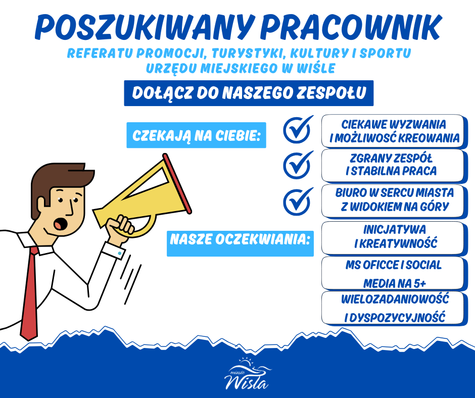 Jeśli jesteś zainteresowany/a i spełniasz nasze wymagania, prześlij swoje CV oraz list motywacyjny na adres: promocja@wisla.pl w temacie wiadomości wpisz "Rekrutacja - Referat Promocji, Turystyki, Kultury i Sportu UM Wisła” lub odwiedź nas bezpośrednio w biurze PTKiS, pl. B. Hoffa 3, Dom Zdrojowy, 43-460 Wisła.
