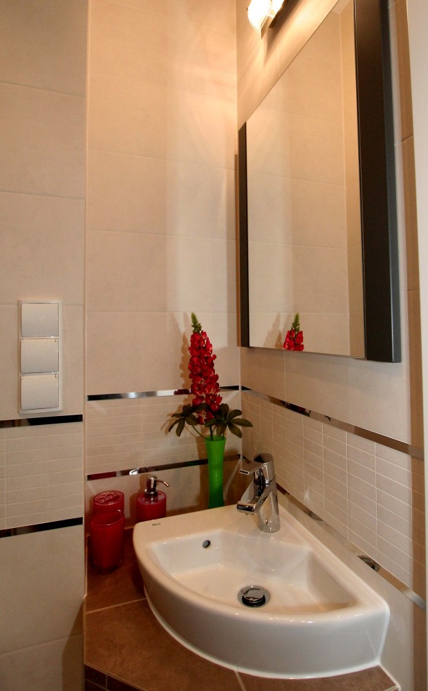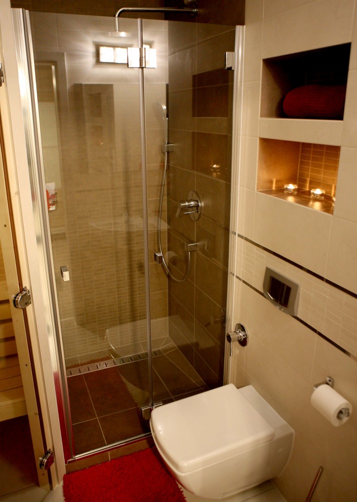 Kabina prysznicowa z deszczownicą, kompakt WC, umywalka, lustro, półki na kosmetyki, stojak na ręczniki / półki na ręczniki, suszarka do włosów, komplet dużych i małych ręczników.