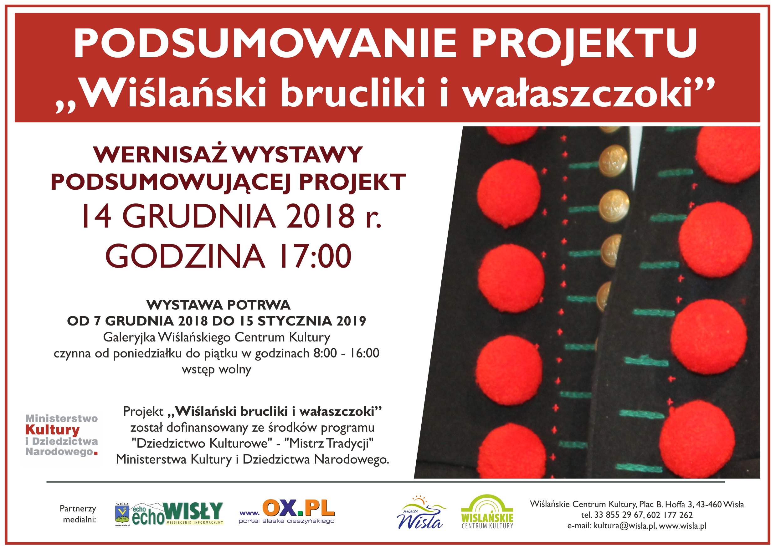 14 grudnia 2018 r. o godzinie 17:00 w Galeryjce Wiślańskiego Centrum Kultury odbędzie się podsumowanie projektu "Wiślański brucliki i wałaszczoki" dofinansowanego ze środków programu "Dziedzictwo Kulturowe" - "Mistrz Tradycji" Ministerstwa Kultury i Dziedzictwa Narodowego.