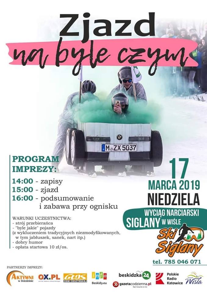 Wyciąg Siglany i Aktywni w Dziedzinie zapraszają na ZJAZD NA BYLE CZYM. Impreza odbędzie się w dniu 17 marca 2019, a ze stoku zjeżdżać będą pojazdy różnej maści. W tym roku jednak do zawodów dopuszczone będą wyłącznie sprzęty własnej produkcji. Zwykłe jabłuszka, sanki, czy narty nie wystarczą. Chodzi o to, by skonstruować własny sprzęt, lub zabawnie zmodyfikować np. tradycyjne sanki.