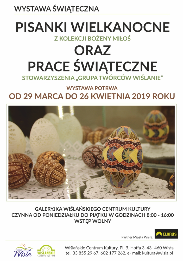 29 marca 2019 r. o godzinie 17:00 w Galeryjce Wiślańskiego Centrum Kultury odbędzie się wernisaż wystawy świątecznej, na której obejrzeć będzie można pisanki z kolekcji Bożeny Miłoś oraz prace świąteczne Stowarzyszenia "Grupa Twórców Wiślanie".
