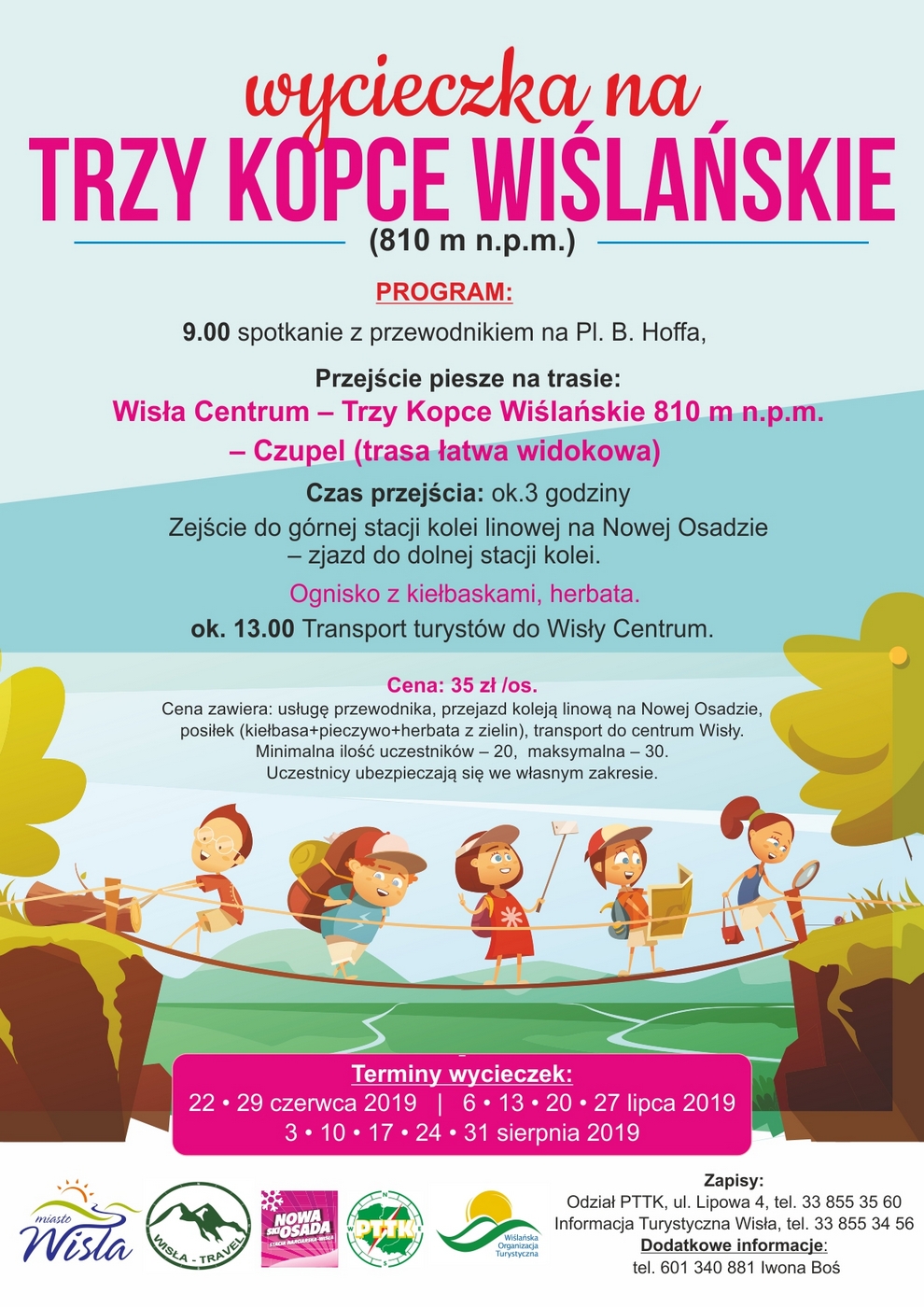 Cena zawiera: usługę przewodnika, przejazd koleją linową na Nowej Osadzie, posiłek (kiełbasa+pieczywo+herbata), transport do centrum Wisły. Uczestnicy ubezpieczają się we własnym zakresie.