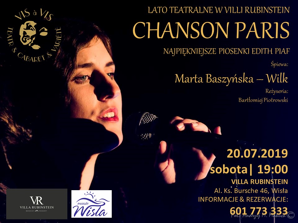 W wyjątkowym programie „CHANSON PARIS” - najpiękniejsze piosenki Edith Piaf, francuskie szlagiery oraz przeboje Ewy Demarczyk, a także wiersze Jacquesa Preverta i Haliny Poświatowskiej - zaśpiewa dla Państwa Marta Baszyńska - Wilk – aktorka scen muzycznych i wokalistka.