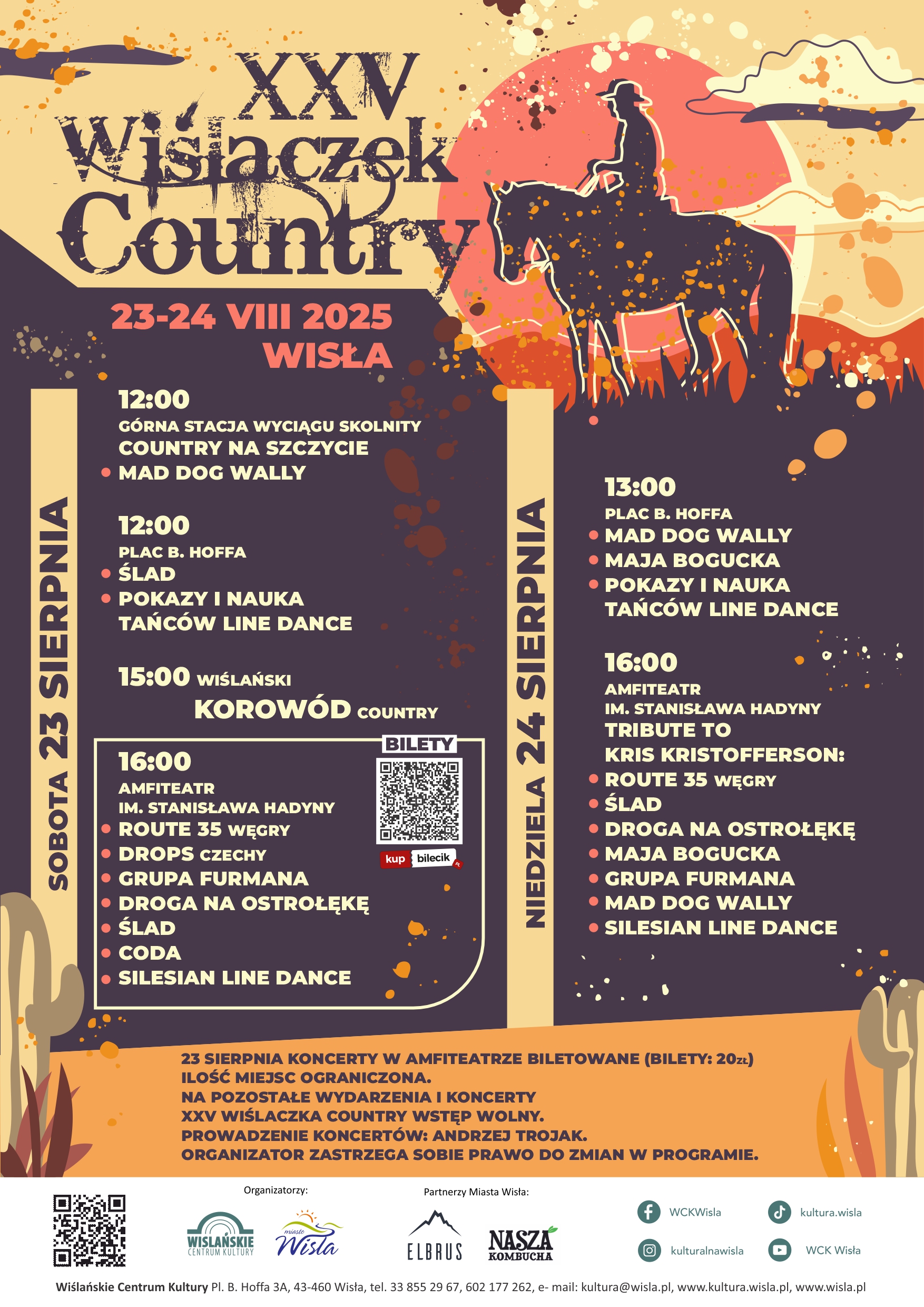 Wielu z Was pyta i niecierpliwie czeka na wieści z "dzikiego zachodu" Beskidów. Oto one! Tegoroczny Wiślaczek Country odbędzie się w dniach 23-24 sierpnia 2025 roku.