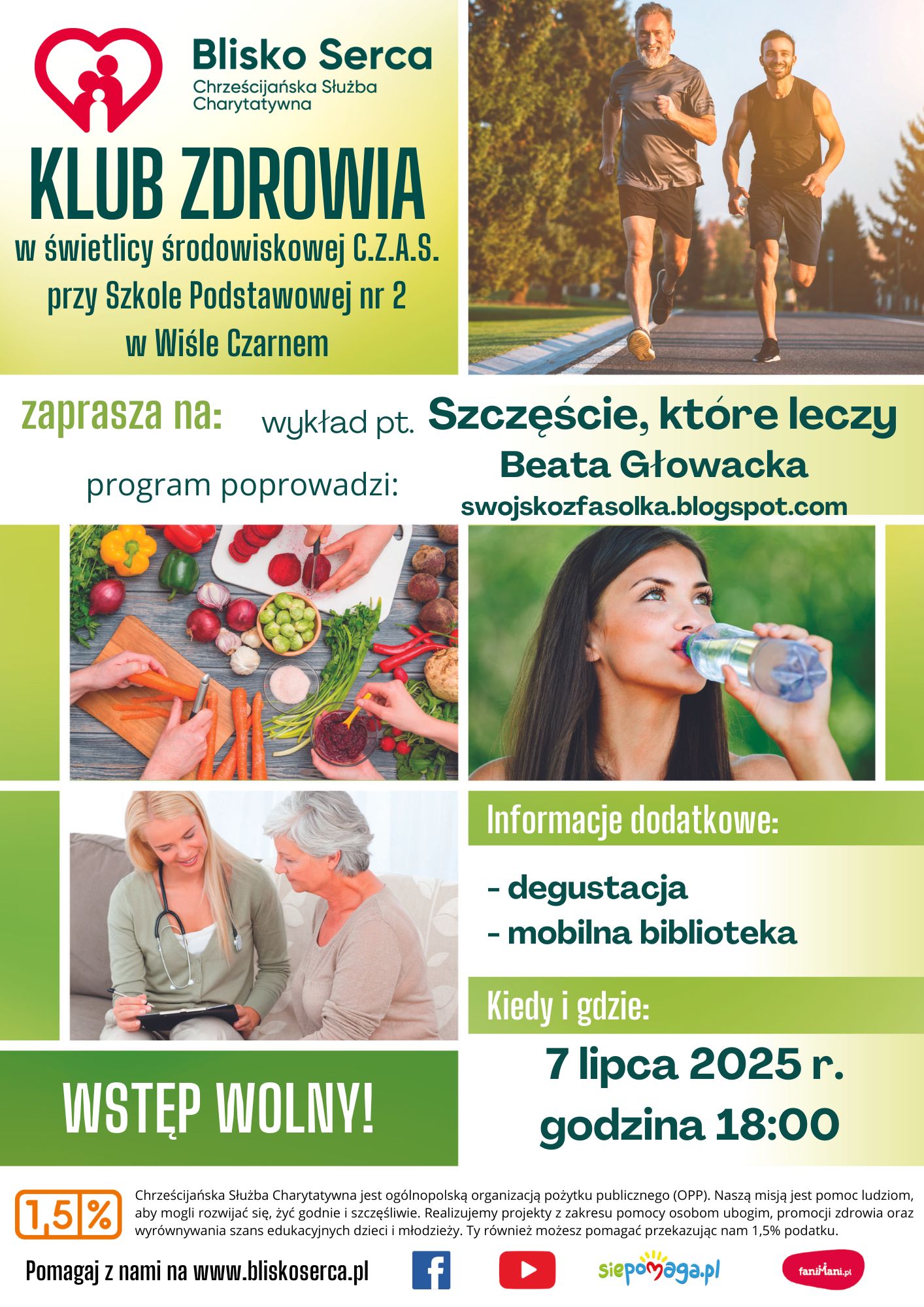 Chrześcijańska Służba Charytatywna „Blisko Serca” zaprasza na wyjątkowe spotkanie w ramach Klubu Zdrowia, które odbędzie się 7 lipca 2025 r. o godzinie 18:00 w świetlicy środowiskowej C.Z.A.S. przy Szkole Podstawowej nr 2 w Wiśle Czarnem.