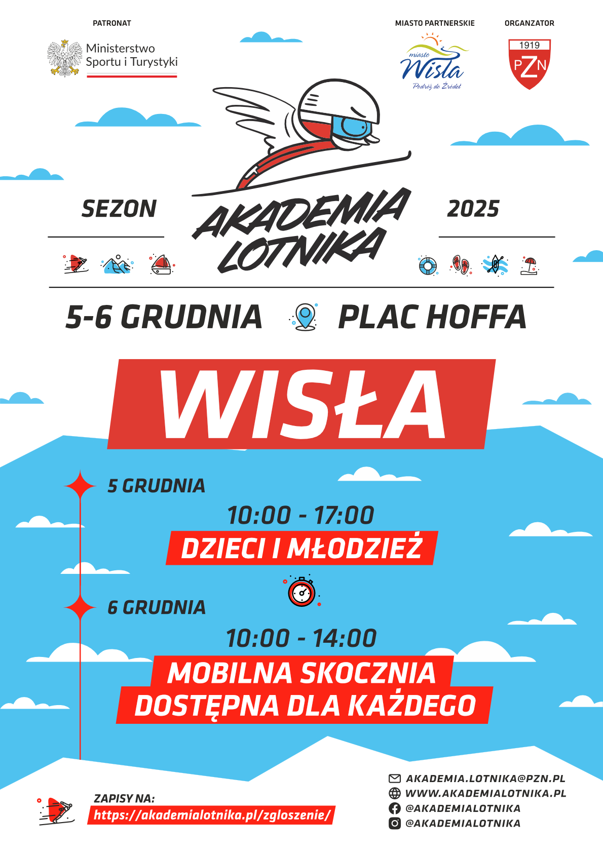 Dodatkowo: od godz. 10:00 do 17:00 odbędzie się Akademia Lotnika - czyli mobilna skocznia wraz ze strefami sportowymi dla dzieci. Szczegóły na stronie: Akademia Lotnika.