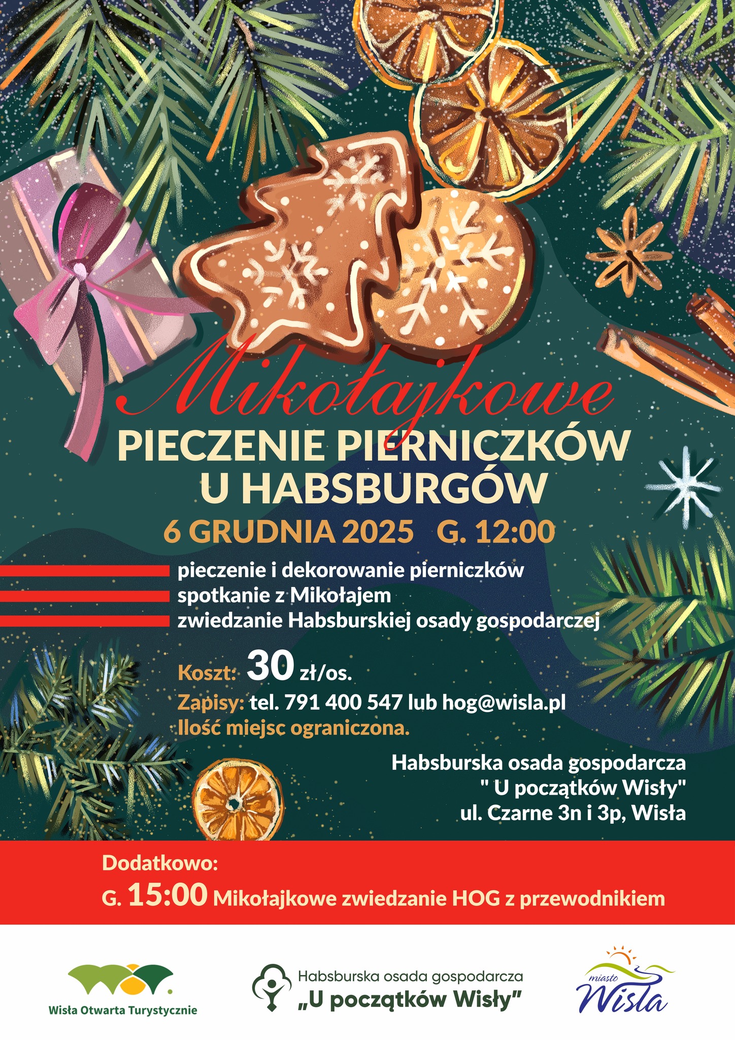 Habsburska osada gospodarcza „U początków Wisły” zaprasza na wyjątkowe, rodzinne wydarzenie mikołajkowe. W sobotę, 6 grudnia 2025 r. o godz. 12.00 odbędzie się wspólne pieczenie i dekorowanie pierniczków, któremu towarzyszyć będzie spotkanie z Mikołajem oraz zwiedzanie Habsburskiej osady gospodarczej.