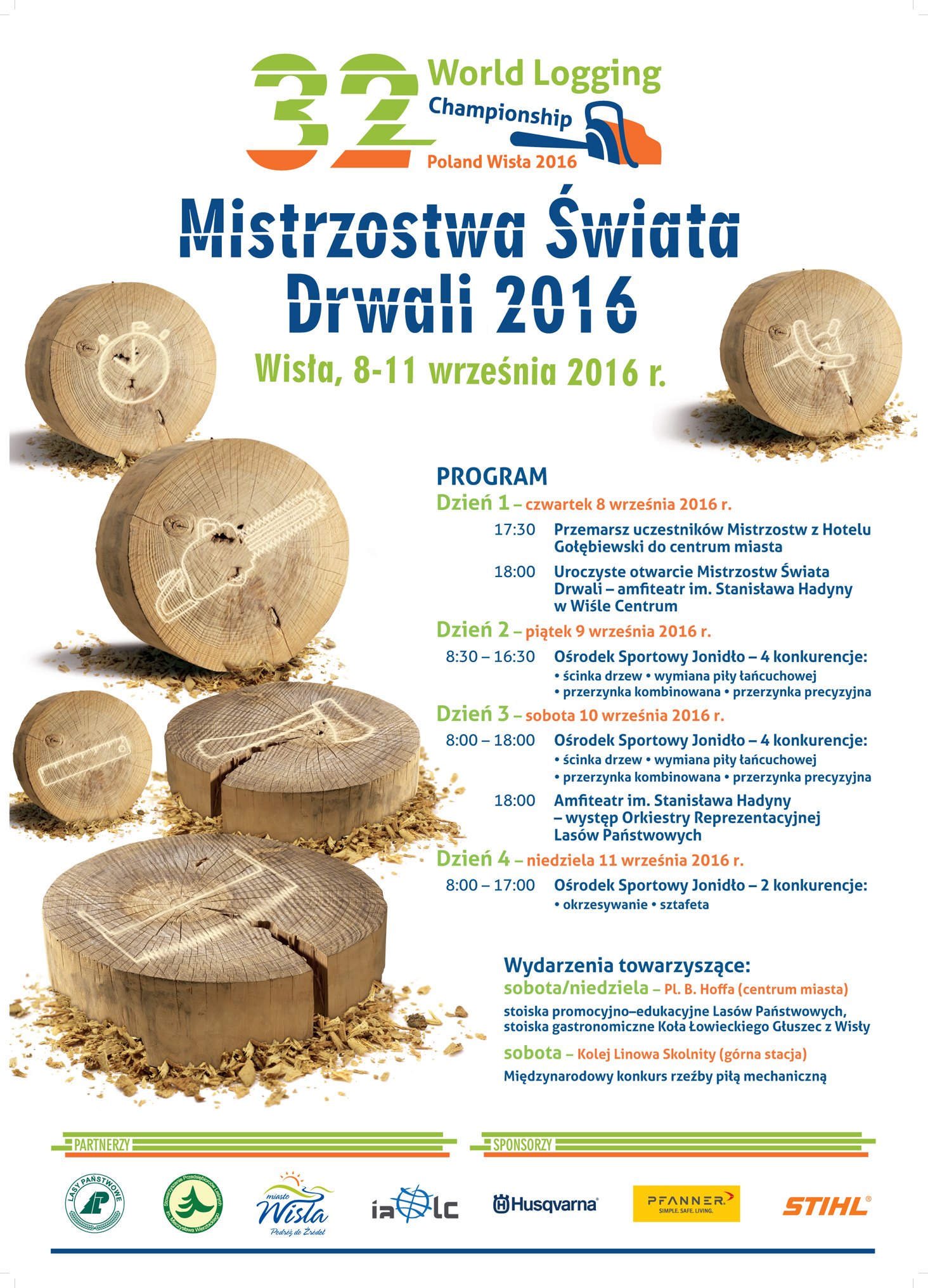 w Polsce, powierzono Stowarzyszeniu Przedsiębiorców Leśnych im. Mieczysława Wierzbickiego w Gołuchowie - organizacji zrzeszającej właścicieli firm sektora usług leśnych, czyli przedsiębiorców świadczących na co dzień usługi dla Lasów Państwowych. Nad przebiegiem zawodów będą czuwali przedstawiciele IALC - International Association Logging Championships. Polskim członkiem IALC jest Stowarzyszenie Przedsiębiorców Leśnych im. Mieczysława Wierzbickiego - organizator Mistrzostw Świata Drwali 2016. Lasy Państwowe są partnerem strategicznym mistrzostw, a współorganizatorem burmistrz miasta Wisły.