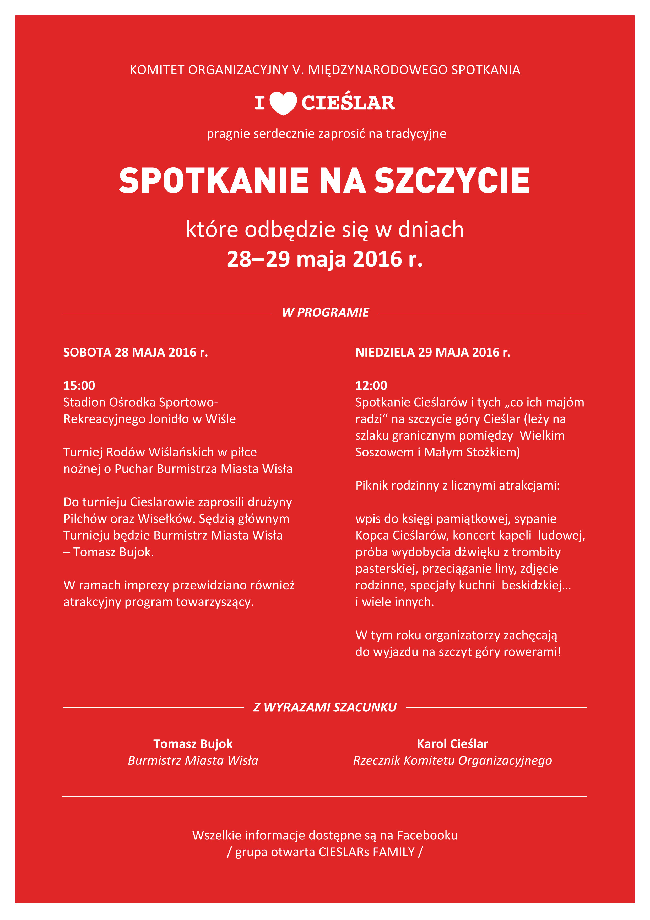 Do turnieju Cieślarów zaprosili drużyny Pilchów oraz Wisełków. Sędzią głównym Turniej będzie Burmistrz Miasta Wisła - Tomasz Bujok.