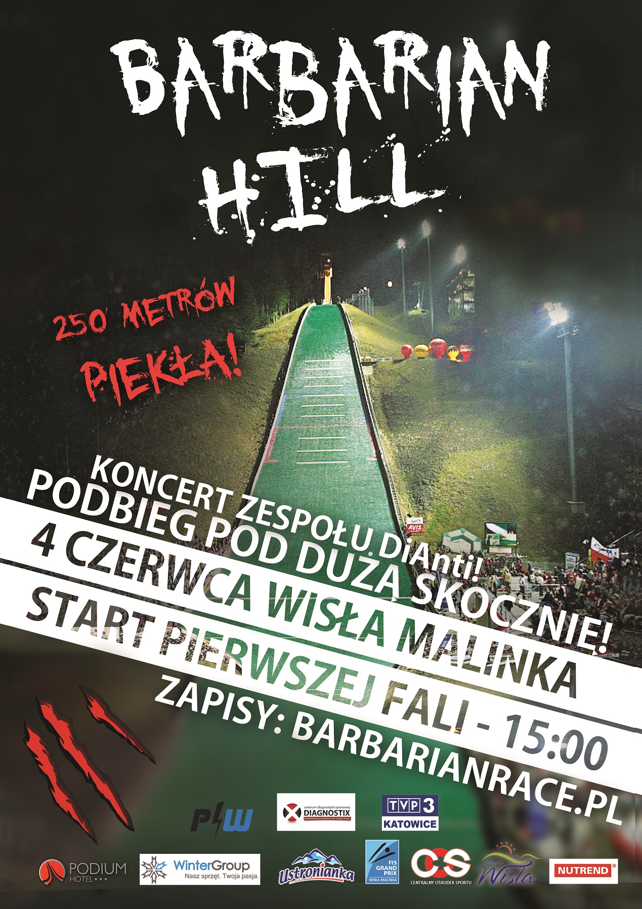 Skocznia narciarska Wisła-Malinka na której odbywają się konkursy Pucharu Świata (HS134m). Powstała już w 1933 roku, a we wrześniu 2008 roku nadano jej imię Adama Małysza, który był wówczas jej rekordzistą. Podbieg pod skocznię im. Adama Małysza w Wiśle figuruje na liście przeszkód Barbarian Race – z którym uczestnicy będą mogli się zmierzyć na początku czerwca w Wiśle. Podbieg ma prawie 35 stopni nachylenia, co stanowi wyzwanie nie tylko dla nowicjuszy, ale też czołowych biegaczy. Jeżeli jeszcze nie jesteś zapisany i obawiasz się tego etapu zawodów, to właśnie okazja dla Ciebie. Możesz sprawdzić się w tym pojedynczym etapie już w sobotę 4-go czerwca, kiedy to skocznia narciarska w Wiśle stanie się areną podbiegów. Startujący będą mieli do pokonania około 250 metrów morderczej trasy, która z pewnością odciśnie swoją moc w niejednych nogach. Jest to finalny sprawdzian dla śmiałków, którzy rozpoczną cykl biegów Barbarian Race w Wiśle i zachęta dla tych niezdecydowanych. Z pewnością podjęcie wyzwania będzie niezapomnianym przeżyciem. Podczas podbiegu do boju zagrzewać was będzie zespół rockowy DiAnti!