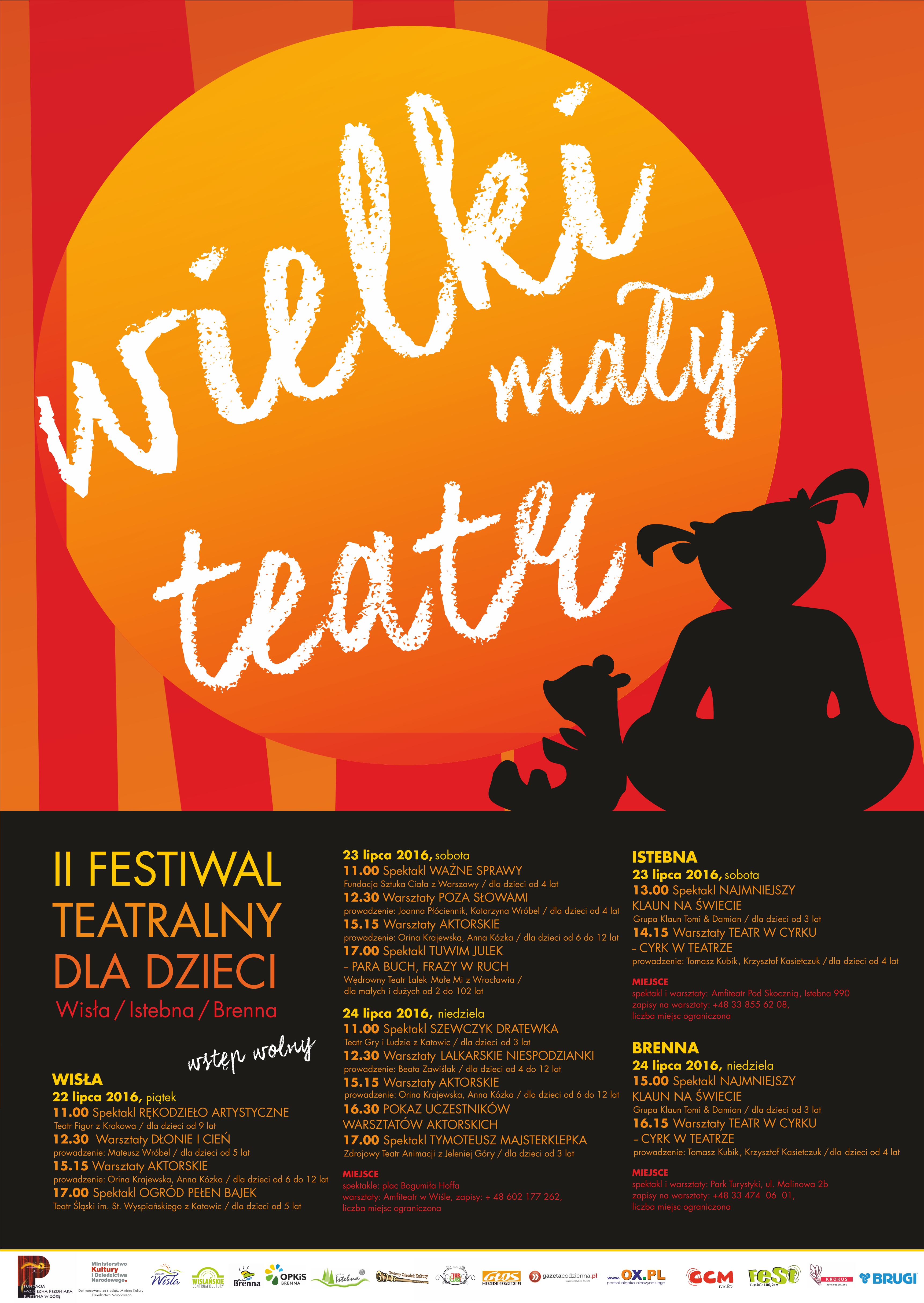 Tegoroczny festiwal trwać będzie aż trzy dni! Dzięki wsparciu Ministra Kultury i Dziedzictwa Narodowego i współpracy z Fundacją Wojciecha Pszoniaka "Kurtyna w Górę" po raz drugi będziemy mogli doświadczyć wielkiego świata teatru w małej beskidzkiej Wiśle. Codziennie spektakle teatralne dla dzieci oraz warsztaty artystyczne rozwijające dziecięcą wrażliwość na sztukę. Szczegółowy program poniżej.