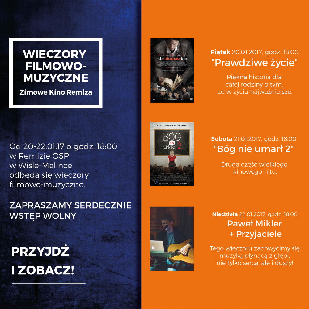 W dniach 20-22 stycznia w Remizie OSP Wisła Malinka odbędą się wieczory filmowo-muzyczne.