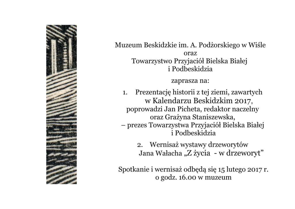 Muzeum Beskidzkie im. A. Podżorskiego w Wiśle serdecznie zaprasza na prezentację historii z tej ziemi, zawartych w KALENDARZU BESKIDZKIM 2017, połączoną z wernisażem wystawy drzeworytów Jana Wałacha "Z życia w drzeworyt".