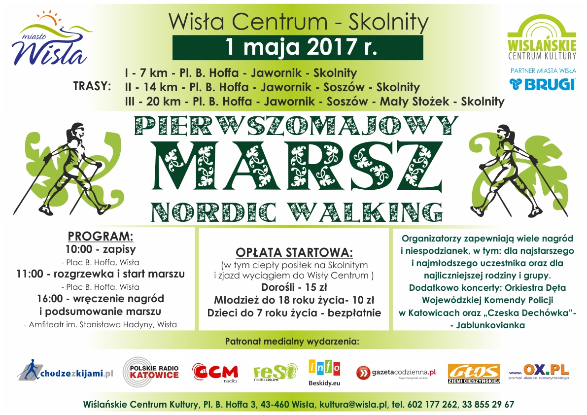 1 maja 2017 roku o godzinie 10:00 zapisami na Placu B. Hoffa w Wiśle rozpocznie się Pierwszomajowy Marsz Nordic Walking. O godzinie 11:00 po wspólnej rozgrzewce odbędzie się marsz. Do wyboru są trzy trasy: