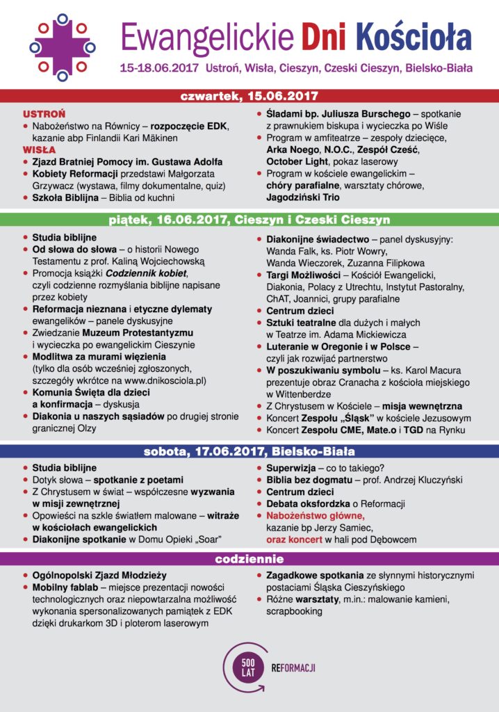 Pełny program wydarzeń w ramacvh Ewangleickich Dni Kościoła znajduje się tutaj: http://dnikosciola.pl/wp-content/uploads/2017/06/Program-EDK.pdf