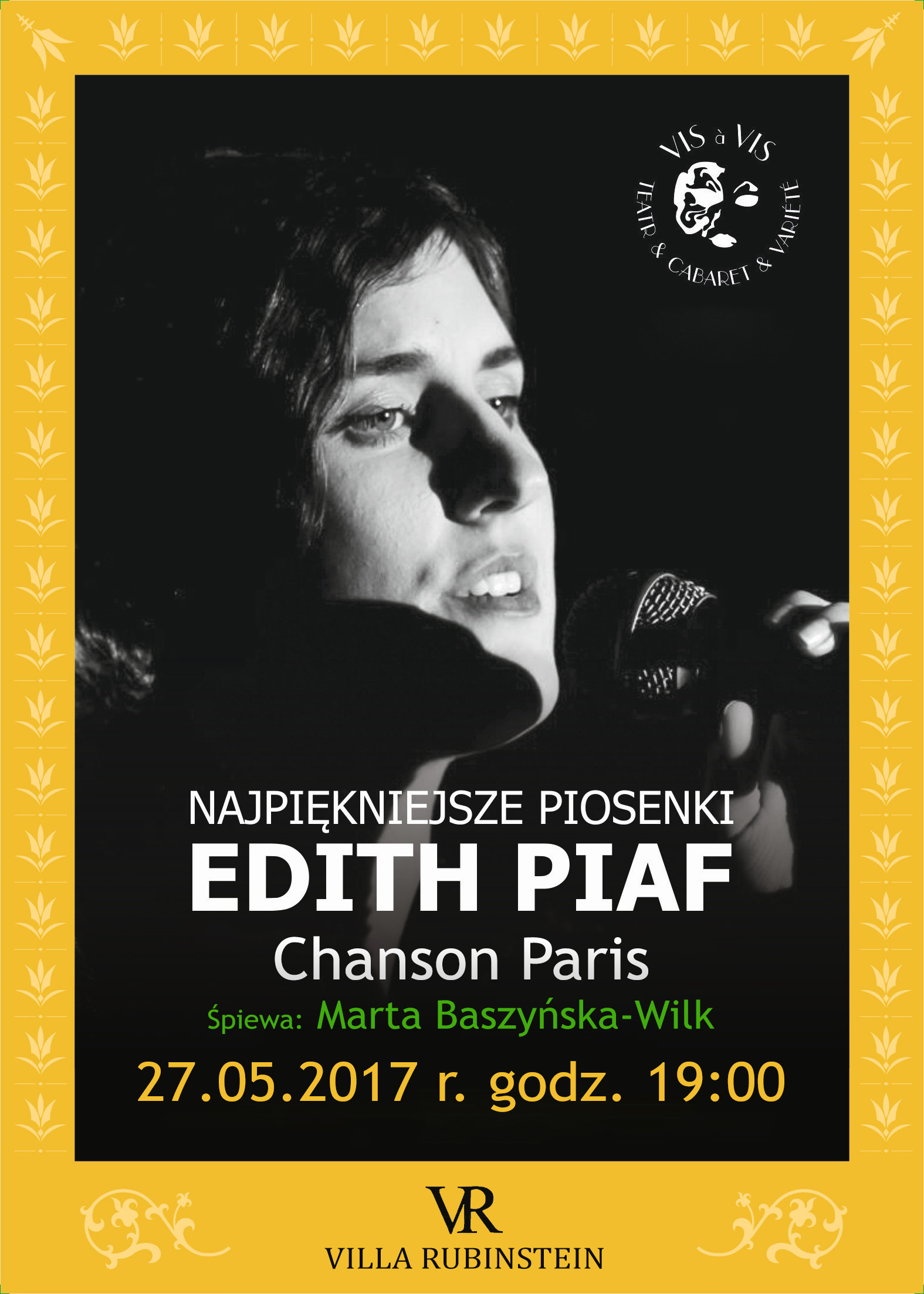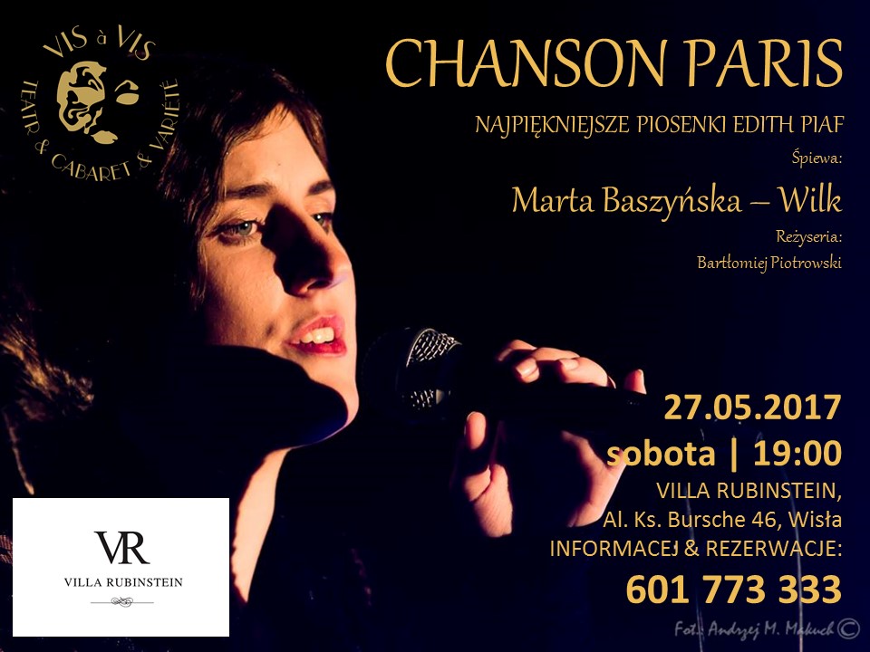 W wyjątkowym programie „CHANSON PARIS” - najpiękniejsze piosenki Edith Piaf, francuskie szlagiery oraz przeboje Ewy Demarczyk, a także wiersze Jacquesa Preverta i Haliny Poświatowskiej - zaśpiewa dla Państwa Marta Baszyńska - Wilk – aktorka scen muzycznych i wokalistka. Jej recital dyplomowy „La vie en rose” którego premiera odbyła się w kultowej, krakowskiej Piwnicy pod Baranami zgromadził rzesze wielbicieli piosenek Edith Piaf oraz talentu Marty.