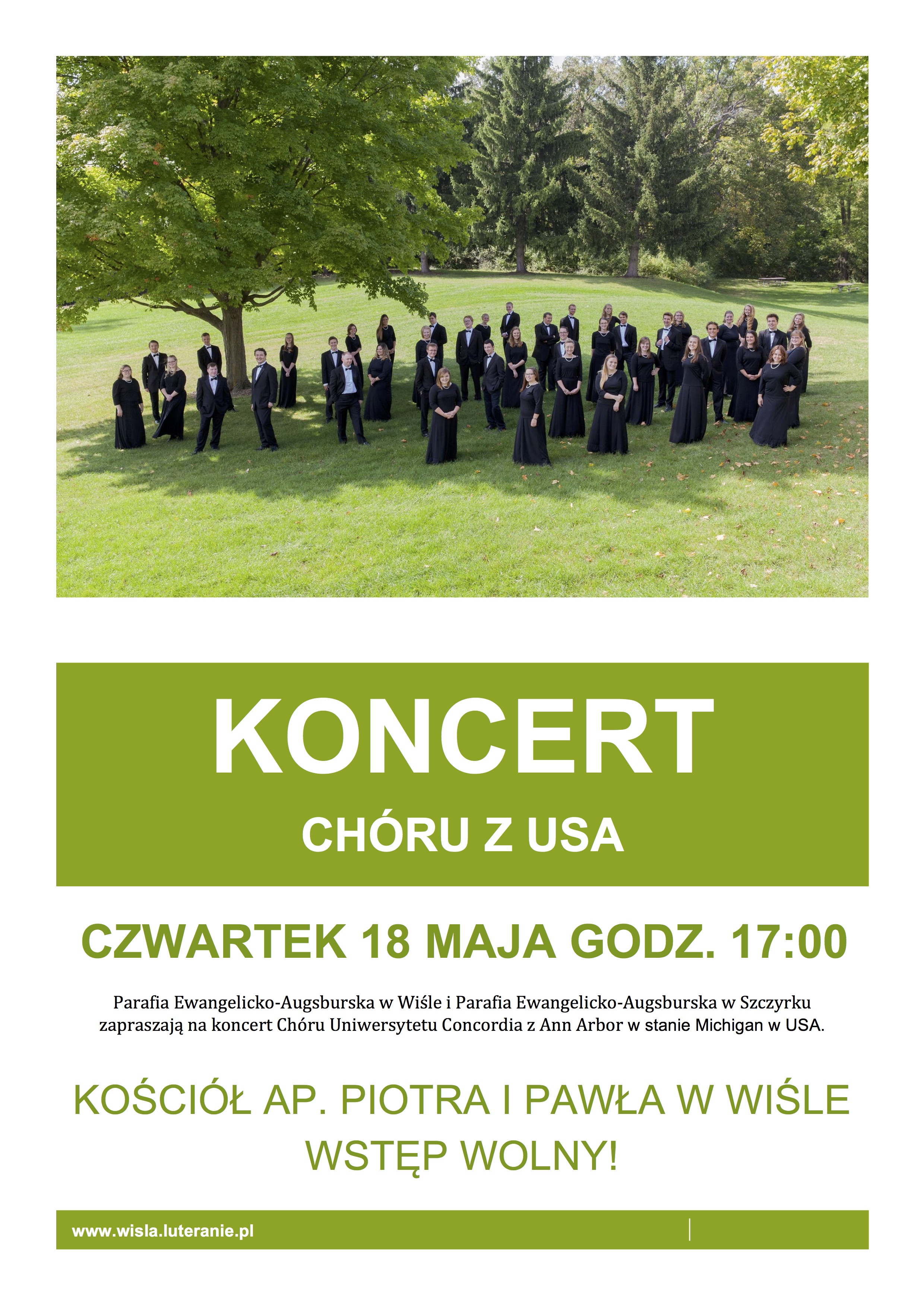 Parafia Ewangelicko-Augsburska w Wiśle i Parafia Ewangelicko-Augsburska w Szczyrku zapraszają na koncert Chóru Uniwersytetu Concordia z Ann Arbor w stanie Michigan w USA.