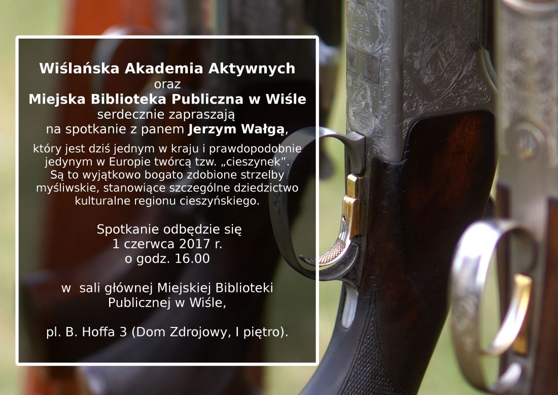 Wiślańska Akademia Aktywnych oraz Miejska Biblioteka Publiczna w Wiśle serdecznie zapraszają na spotkanie z panem Jerzym Wałgą, który jest dziś jednym w kraju i prawdopodobnie jedynym w Europie twórcą tzw. „cieszynek”. Są to wyjątkowo bogato zdobione strzelby myśliwskie, stanowiące szczególne dziedzictwo kulturalne regionu cieszyńskiego.