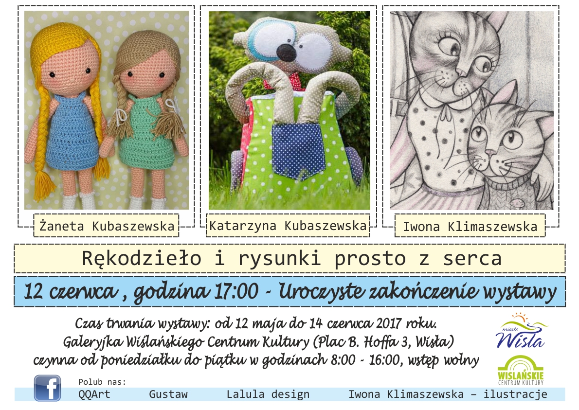 Od 12 maja w Galeryjce Wiślańskiego Centrum Kultury oglądać można wystawę pt. " Rękodzieło i rysunki prosto z serca". Coś uszytego, coś zrobionego na szydełku, coś narysowanego - autorki wystawy- Żaneta Kubaszewska, Katarzyna Kubaszewska oraz Iwona Klimaszewska tworzą z potrzeby serca. Wystawa skierowana jest przede wszystkim do najmłodszych odbiorców, ale z pewnością przypadnie do gustu także dorosłym. Wstęp na wystawę jest bezpłatny. Galeryjka Wiślańskiego Centrum Kultury czynna jest od poniedziałku do piątku w godzinach od 8:00 do 16:00. Wystawa potrwa do 14 czerwca. Serdecznie zapraszamy.