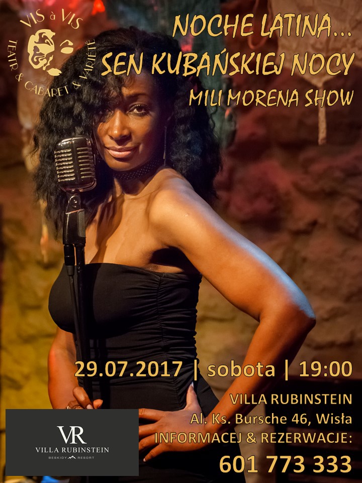 Największe szlagiery muzyki latynoskiej (…i nie tylko) zaśpiewa Gwiazda Teatru VIS a VIS, rodowita Kubanka, artystka sceny i estrady, charyzmatyczna i zjawiskowa MILI MORENA.