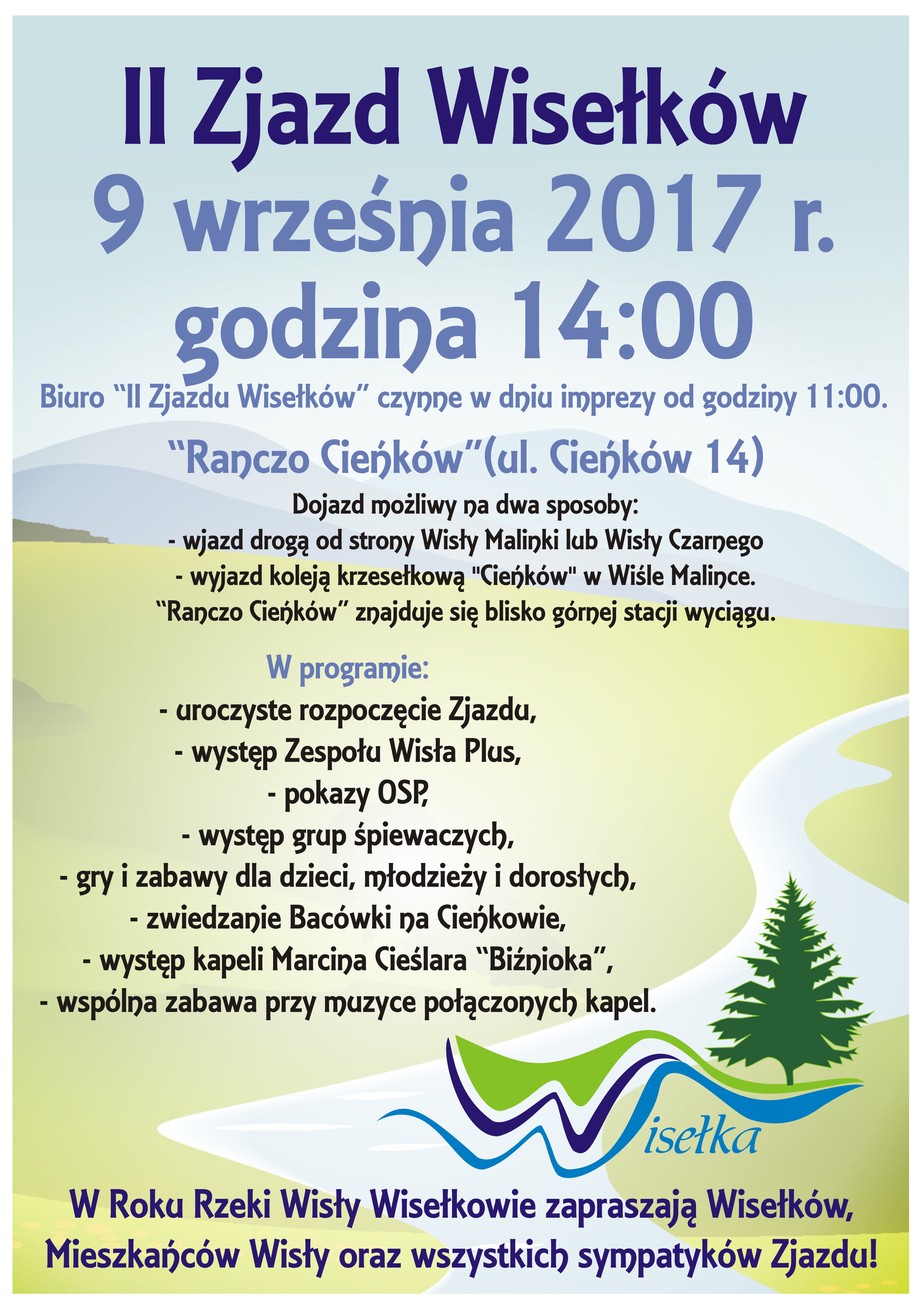 9 września, w Roku Rzeki Wisły, Wisełkowie zapraszają Wisełków, mieszkańców Wisły oraz wszystkich sympatyków na II Zjazd Wisełków! Początek o godz. 14:00, jednak Biuro II Zjazdu Wisełków czynne będzie w dniu imprezy od godziny 11:00.