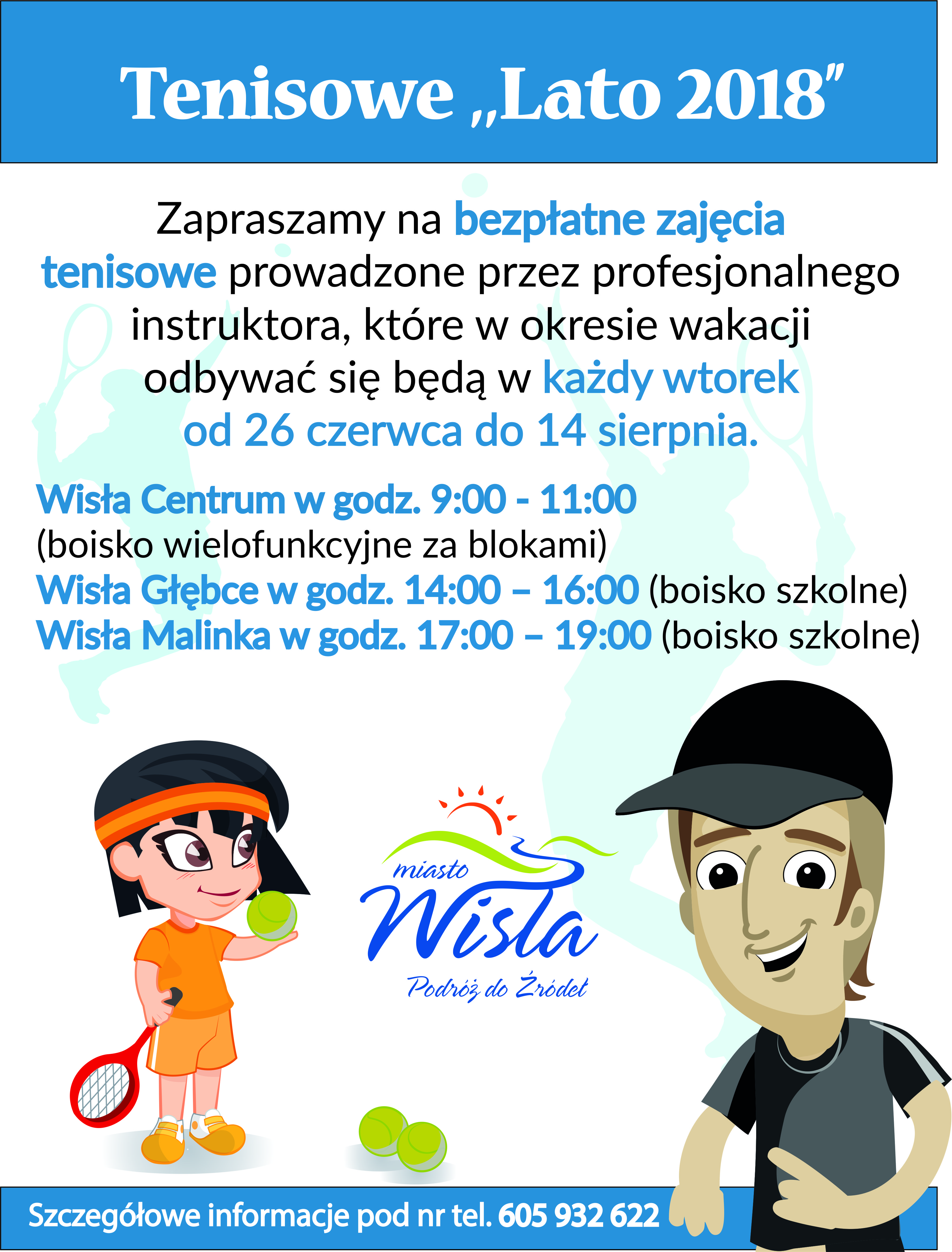 Zapraszamy na bezpłatne zajęcia tenisowe prowadzone przez profesjonalnego instruktora, które w okresie wakacji odbywać się będą w każdy wtorek od 26 czerwca do 14 sierpnia 2018 r.