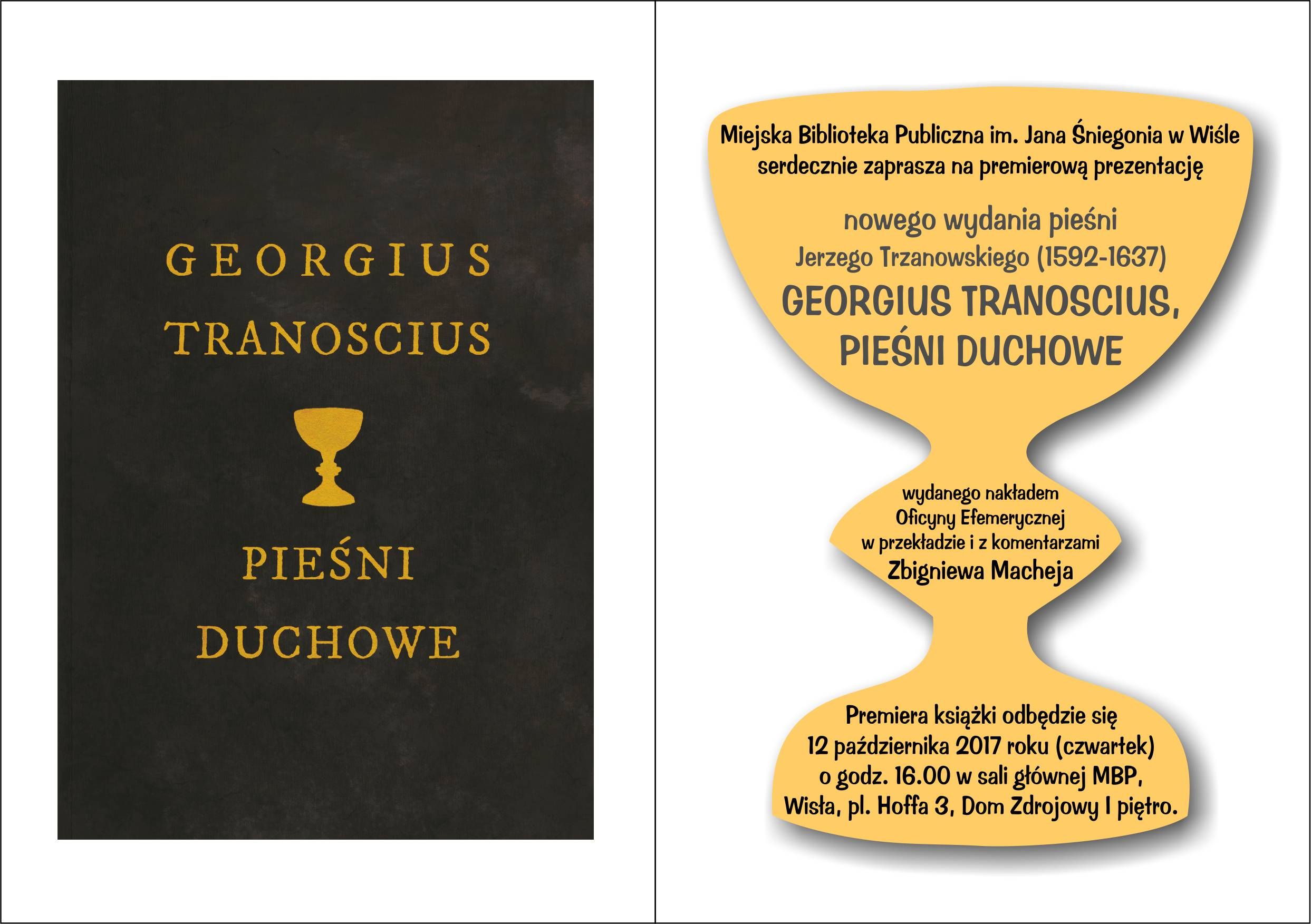 Miejska Biblioteka Publiczna im. Jana Śniegonia w Wiśle serdecznie zaprasza na premierową prezentację nowego wydania pieśni Jerzego Trzanowskiego (1592-1637) "Georgius Tranoscius, Pieśni duchowe", wydanego nakładem Oficyny Efemerycznej w przekładzie i z komentarzam Zbigniewa Macheja