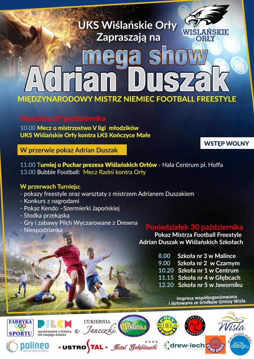 UKS Wiślańskie Orły zapraszają w dniu 29 października na Mega Show z udziałem Adriana Duszaka - międzynarodowego mistrza Niemiec w football freestyle.